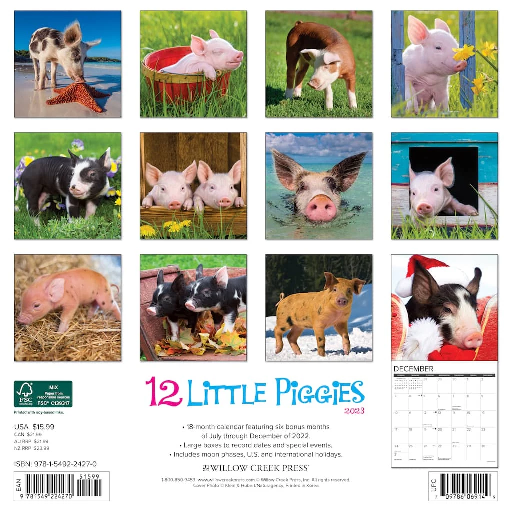 What’s cuter than a little piglet? How about 12 of them? This bright and cheerful calendar features a full year of charming full color photographs of these chubby barnyard darlings! Printed with soy-based inks on FSC certified paper, this 12″ x 12″ wall calendar features large monthly grids that offer ample room for jotting notes, along with six bonus months of July through December of 2022. Also includes moon phases (CST), standard U.S. and international holidays.