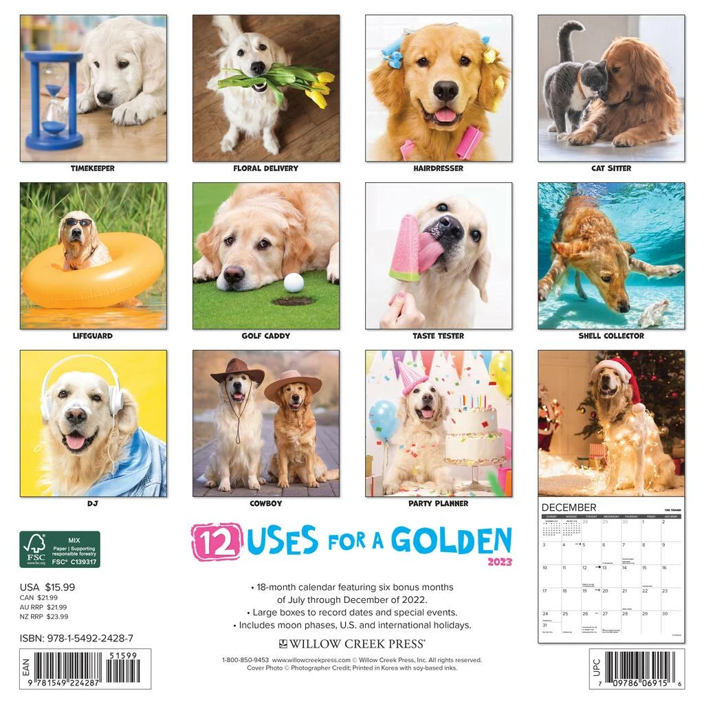 Not only are Golden Retrievers terrific companions and great to look at, they are also ready willing and able to perform countless tasks for their masters. Their heretofore hidden talents include backseat driving, home security alarm system, foot warmer, taste tester and more. The large format displays a full year of full color photographs demonstrating humorous uses for these wonderful dogs. Printed with soy-based inks on FSC certified paper, this 12″ x 12″ wall calendar features large monthly grids that offer ample room for jotting notes, along with six bonus months of July through December of 2022. Also includes moon phases (CST), standard U.S. and international holidays.