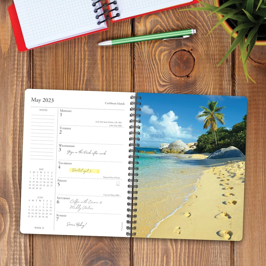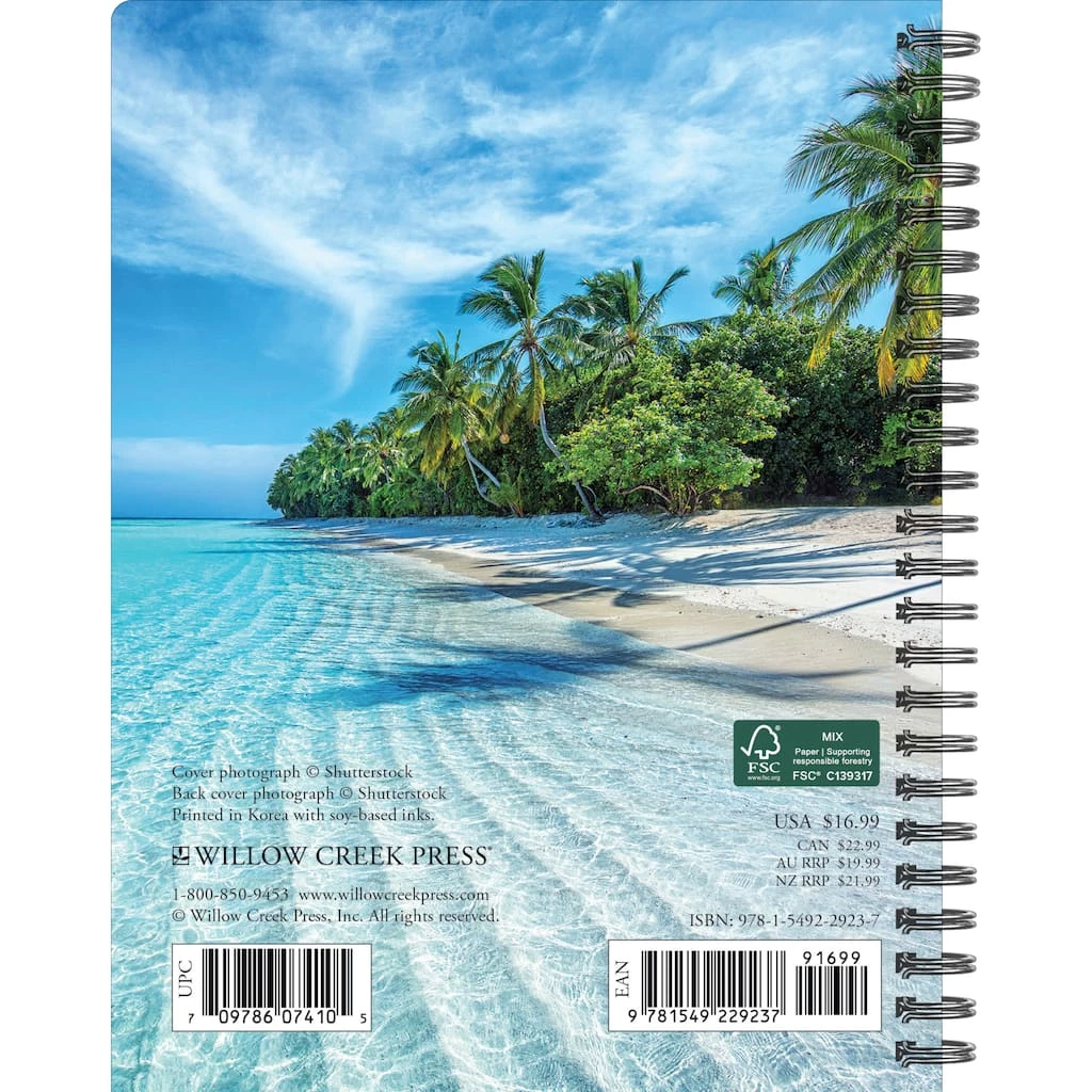 Picture yourself on a sunlit, sugar-sand beach before a turquoise sea. This 12-month planner transports you to a tropical paradise throughout the year with full-color, sunlit images. Printed with soy-based inks on FSC certified paper, this engagement calendar includes a protective cover sleeve, Wire-O binding, and a handy inner pocket for organizing receipts and loose papers. Its 12-month, week-per-page format includes a notes section with extra notes pages in the back to help organize your busy life. This calendar also includes moon phases (CST), standard U.S., and international holidays.