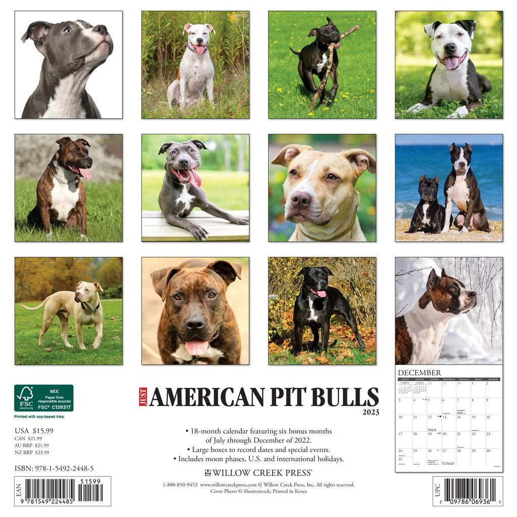 American Pit Bull Terriers are renowned for their strength, intelligence and willingness to please. The wide head and muscular body are imposing, yet their good-natured personality make life a joy for their owners. Printed with soy-based inks on FSC certified paper, this 12″ x 12″ wall calendar features large monthly grids that offer ample room for jotting notes, along with six bonus months of July through December of 2022. It also includes moon phases (CST), standard U.S. and international holidays.
