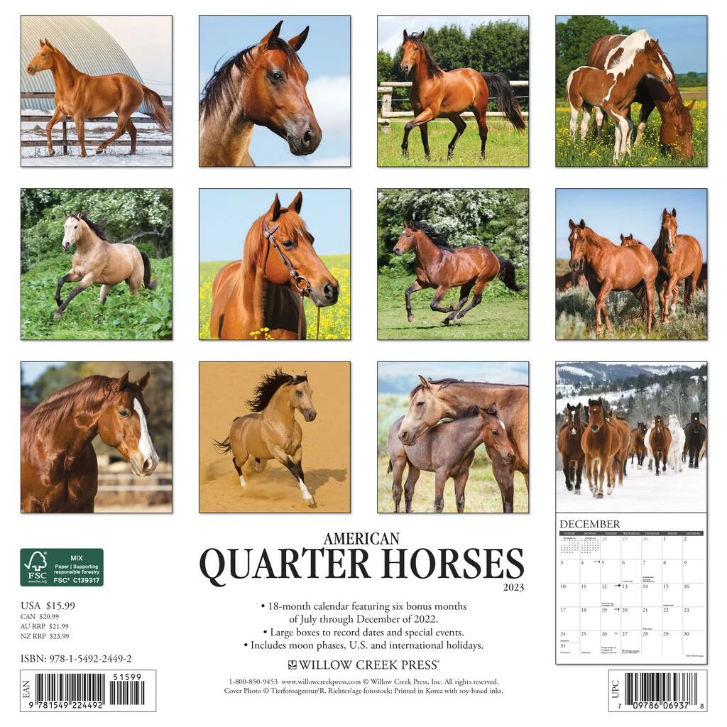 The ready, willing and able American quarter horse is the most popular horse breed in the U.S. for good reason. They are not only lightning quick over short distances, but their general athleticism and temperament make them perfect for ranch work and rodeos. Printed with soy-based inks on FSC certified paper, this 12″ x 12″ wall calendar features large monthly grids that offer ample room for jotting notes, along with six bonus months of July through December of 2022. It also includes moon phases (CST), standard U.S. and international holidays.