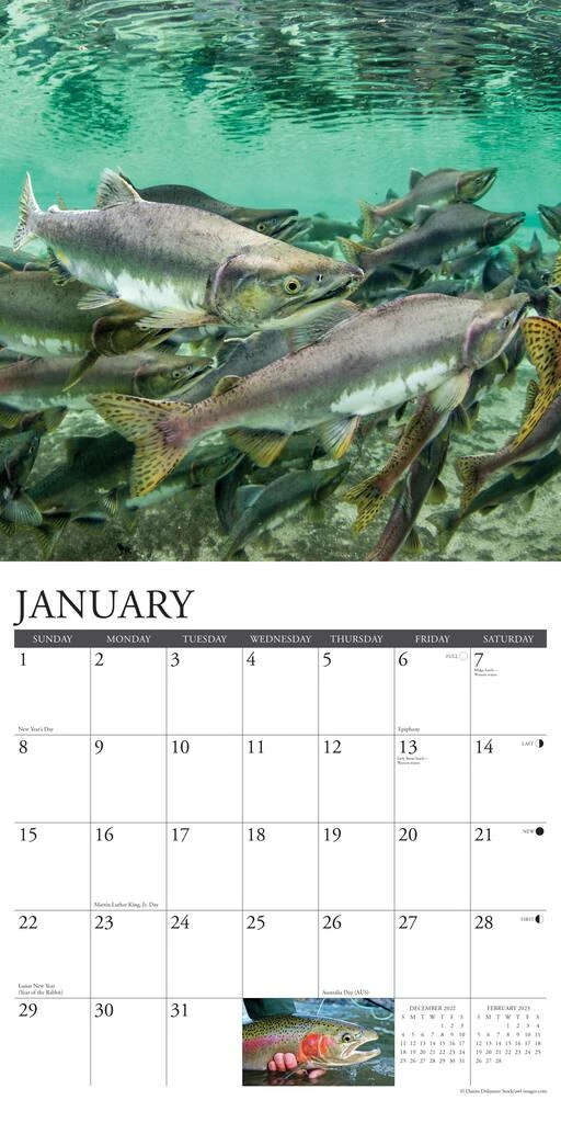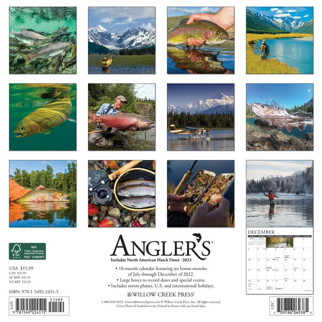 Since its initial debut in 1975, Anglerβs has been the fly fishermanβs favorite wall calendar. Twenty four vivid full color photographs feature game fish and worldwide fly fishing destinations. Also included are important hatch dates across North America. Printed with soy-based inks on FSC certified paper, this 12″ x 12″ wall calendar features large monthly grids that offer ample room for jotting notes, along with six bonus months of July through December of 2022. It also includes moon phases (CST), standard U.S. and international holidays.
