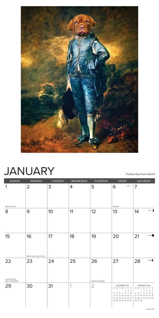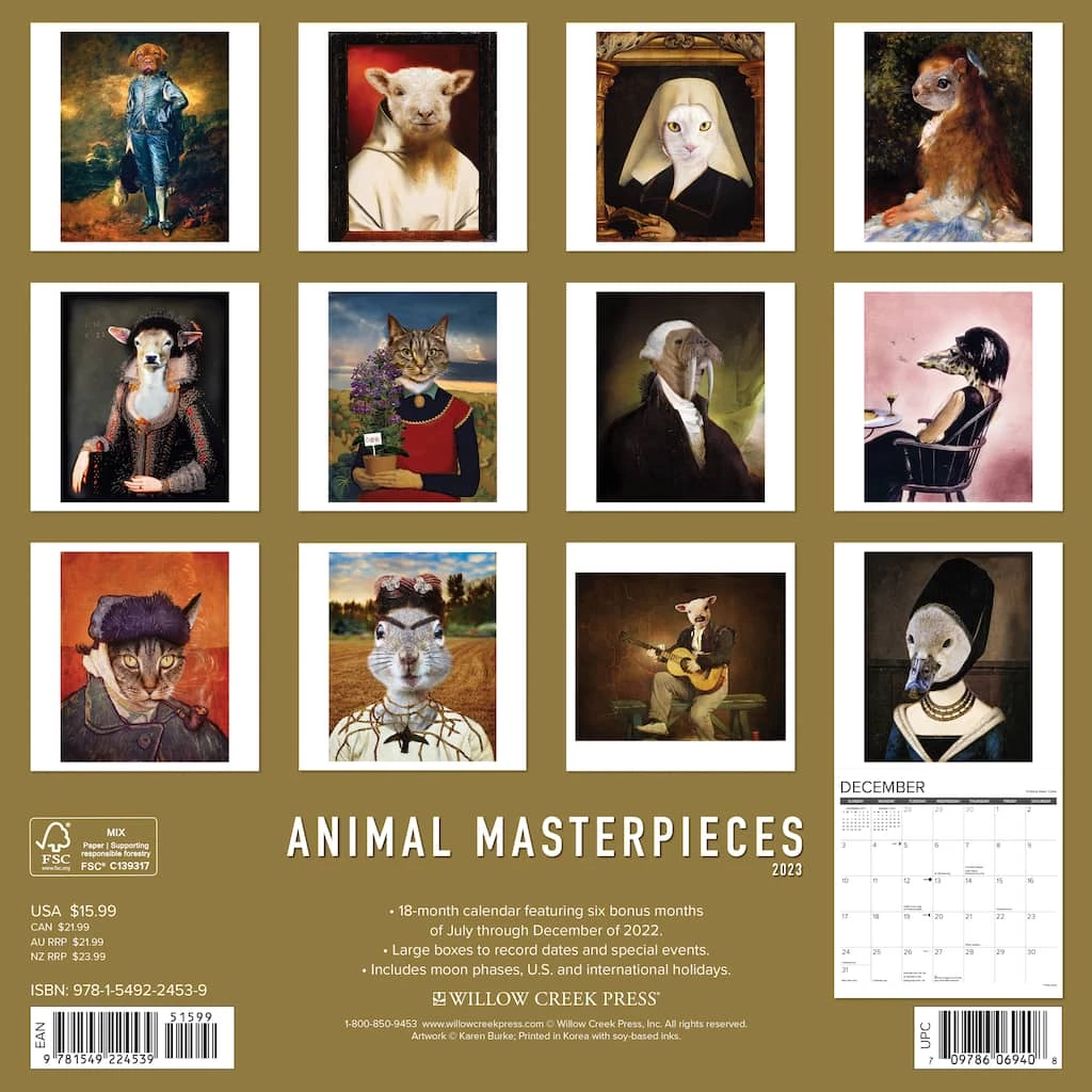 Animal Masterpieces pays tribute to the Old Masters by giving their iconic artwork a twist. The Squirrel with the Pearl Earring, Feline Gothic, the Scream(ing) Sheep all offer a tip of the hat and a bit of art history fun. Printed with soy-based inks on FSC certified paper, this 12″ x 12″ wall calendar features large monthly grids that offer ample room for jotting notes, along with six bonus months of July through December of 2022. It also includes moon phases (CST), standard U.S. and international holidays.