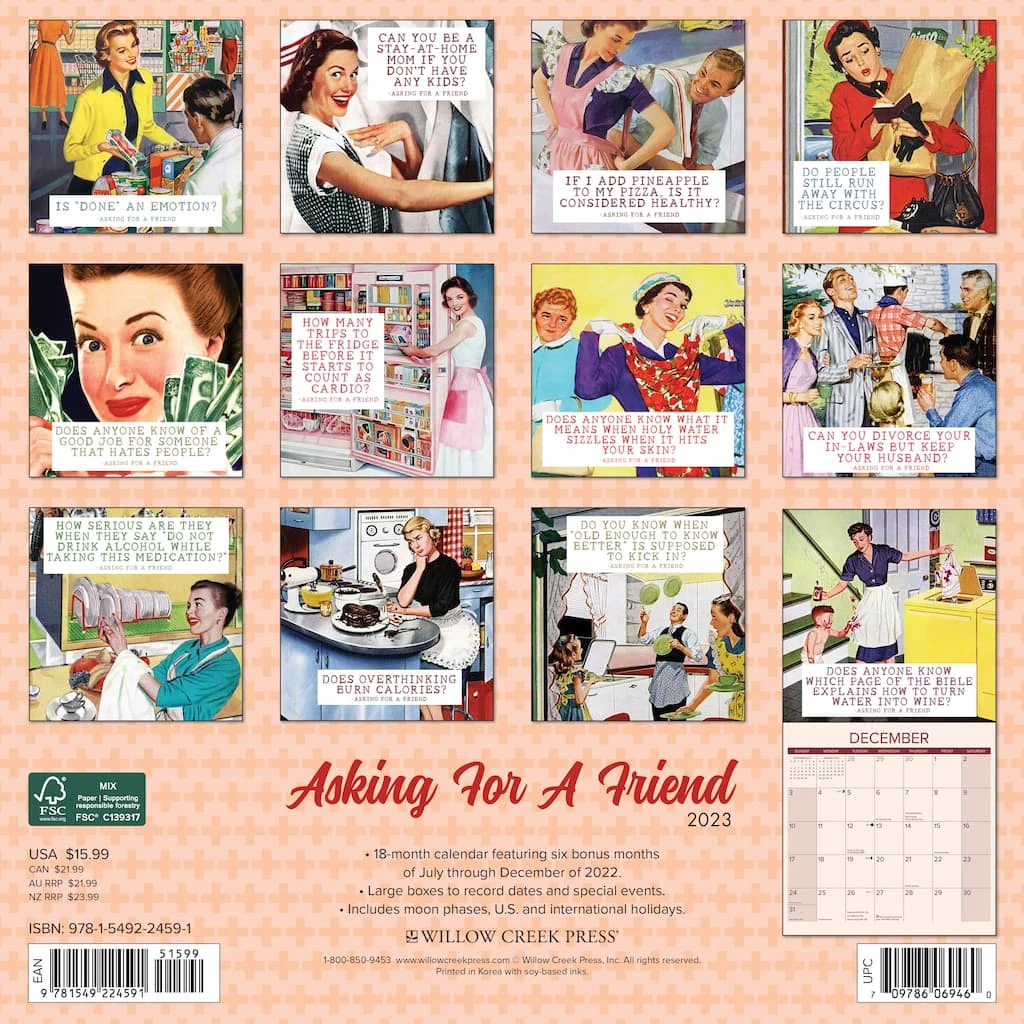 “Is it socially acceptable to eat your weight in queso?” Asking for a Friend asks the irreverent questions of your subconscious with a blend of retro flair and snarky sass that never goes out of style. Printed with soy-based inks on FSC certified paper, this 12″ x 12″ wall calendar features large monthly grids that offer ample room for jotting notes, along with six bonus months of July through December of 2022. It also includes moon phases (CST), standard U.S. and international holidays.