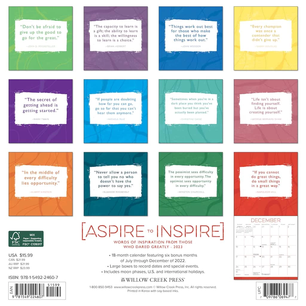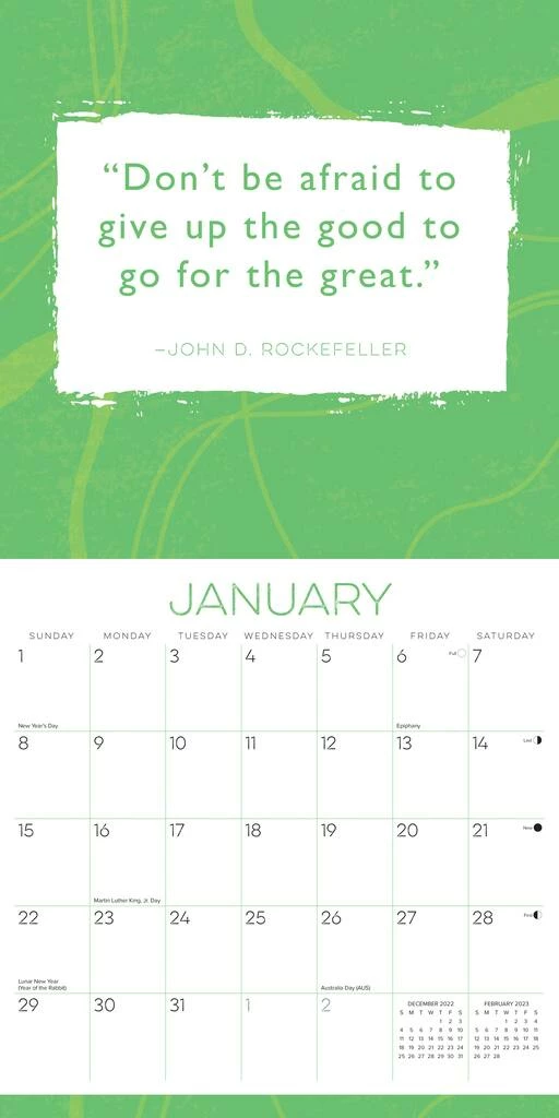 Positivity breeds positivity, habit creates habit. Modern, minimalist design frames monthly quotes of inspiration and their challenge for each of us to dare greatly every day. Printed with soy-based inks on FSC certified paper, this 12″ x 12″ wall calendar features large monthly grids that offer ample room for jotting notes, along with six bonus months of July through December of 2022. Also includes moon phases (CST), standard U.S. and international holidays.