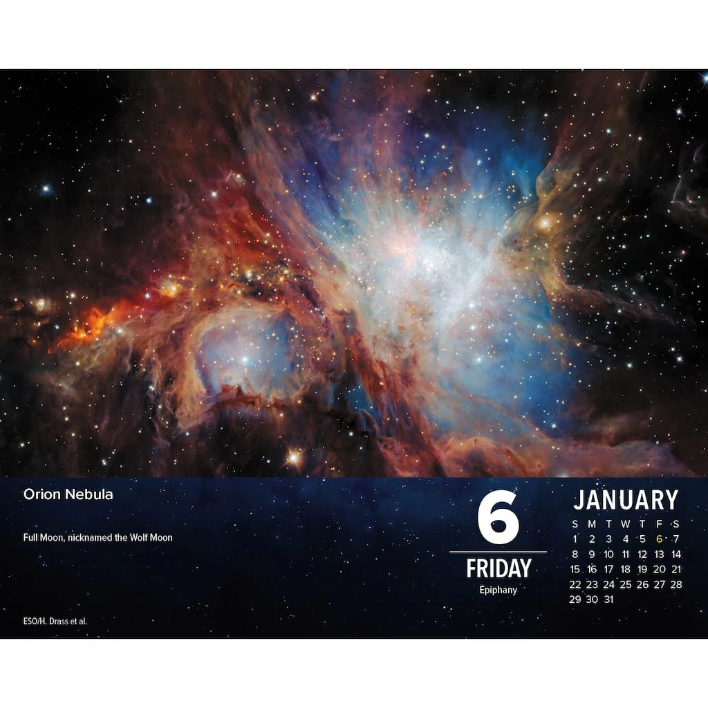 Marvel in the magnificence of our solar system. From distant galaxies sprinkled with supernova remnants to technicolor nebulas swirling across the cosmos, this daily calendar will inspire you to look beyond the world we know and stoke your curiosity for the far-flung regions of outer space. Full-color, easy tear-off pages are printed on high-quality, FSC certified paper with soy-based inks. All major public and culturally significant holidays are included, along with historical and astrological events.