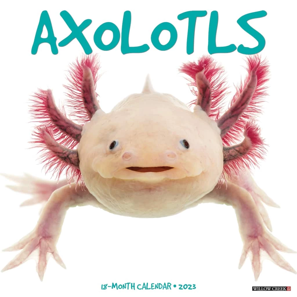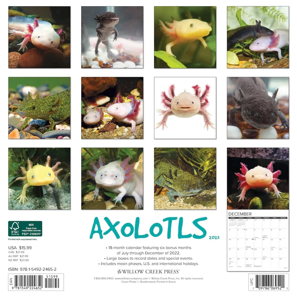 Named for an Aztec God, the Axolotl (pronounced ACK-suh-LAH-tuhl) is a Mexican walking fish that decided to never grow up. They retain their larval features throughout life and are found almost exclusively in the waters of the Xochimilco lake complex. Despite the adorable grin on their faces, these critically endangered creatures are currently facing extinction from pollution and urban sprawl. Printed with soy-based inks on FSC certified paper, this 12″ x 12″ wall calendar features large monthly grids that offer ample room for jotting notes, along with six bonus months of July through December of 2022. It also includes moon phases (CST), standard U.S. and international holidays.