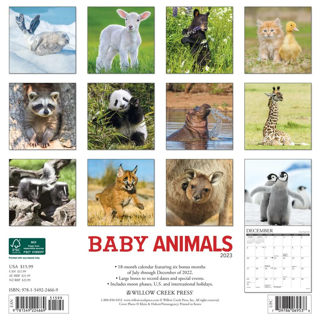 Wild and wide-eyed innocence is the unapologetic Β theme in this heartwarming calendar. Twelve adorable photographs of precious little animal babies will delight you throughout the year! Printed with soy-based inks on FSC certified paper, this 12″ x 12″ wall calendar features large monthly grids that offer ample room for jotting notes, along with six bonus months of July through December of 2022. It also includes moon phases (CST), standard U.S. and international holidays.