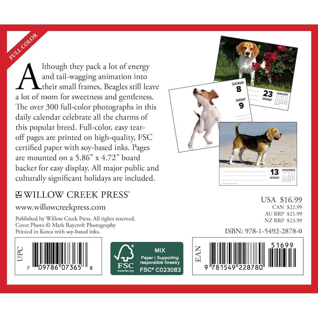 Although they pack a lot of energy and tail-wagging animation into their small frames, Beagles still leave a lot of room for sweetness and gentleness. The 310 full-color photographs in this daily calendar celebrate all the charms of this popular breed. Brighten every day of your year with the incomparable Beagle! All major public and culturally significant holidays are included.