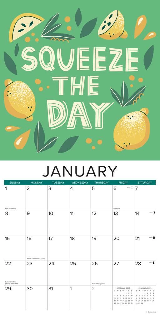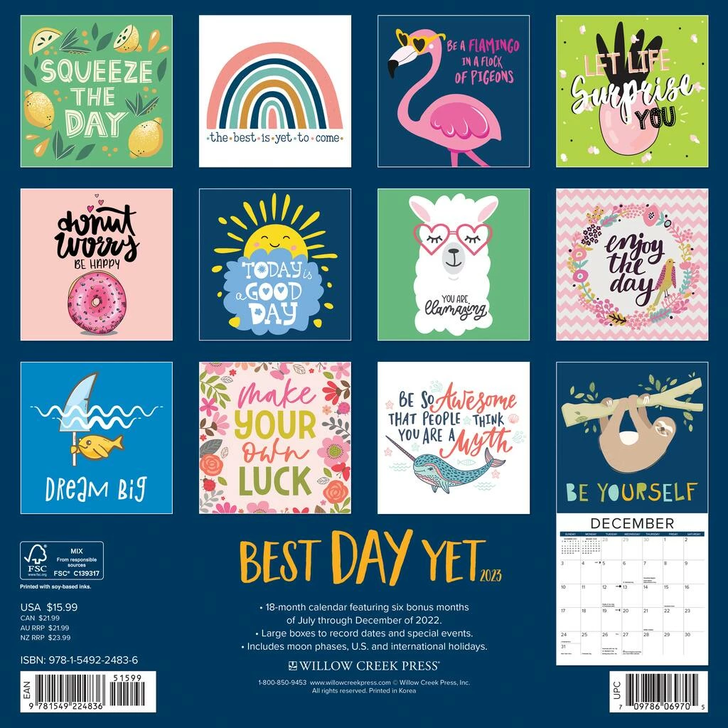 Begin your year on a positive note with this delightful inspirational calendar. These colorful hand-lettered aspirations are as charming as they are inspiring. Printed with soy-based inks on FSC certified paper, this 12″ x 12″ wall calendar features large monthly grids that offer ample room for jotting notes, along with six bonus months of July through December of 2022. Also includes moon phases (CST), standard U.S. and international holidays.