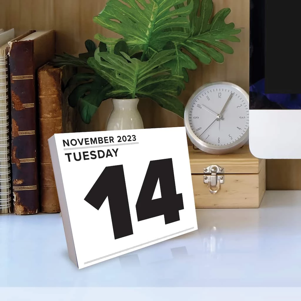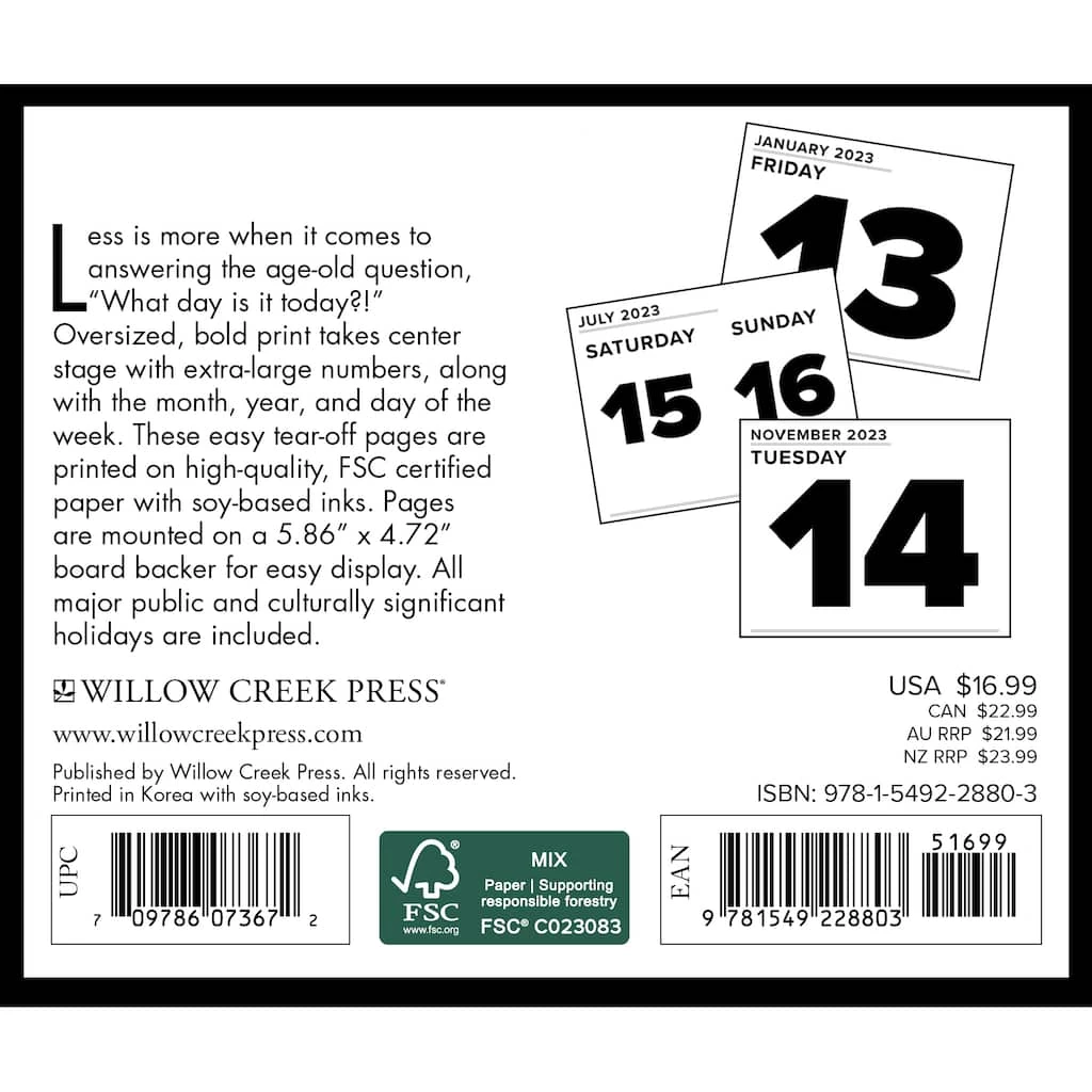 Less is more when it comes to answering the age-old question, “What day is it today?!” Oversized, bold print takes center stage with extra-large numbers, along with the month, year, and day of the week. Easy tear-off pages are printed with soy-based inks on FSC certified paper and are mounted on a recyclable stand for easy display. All major public and culturally significant holidays are included.