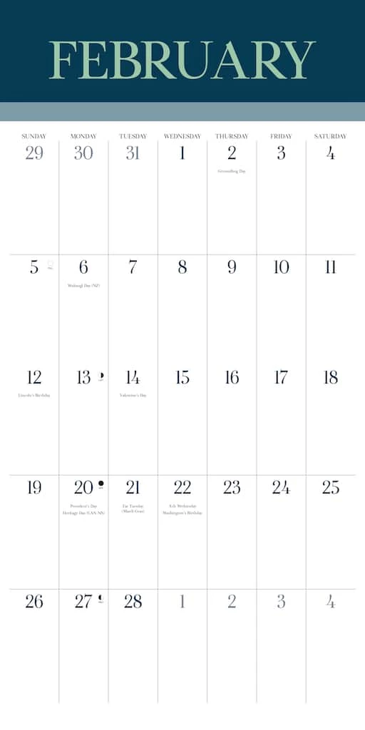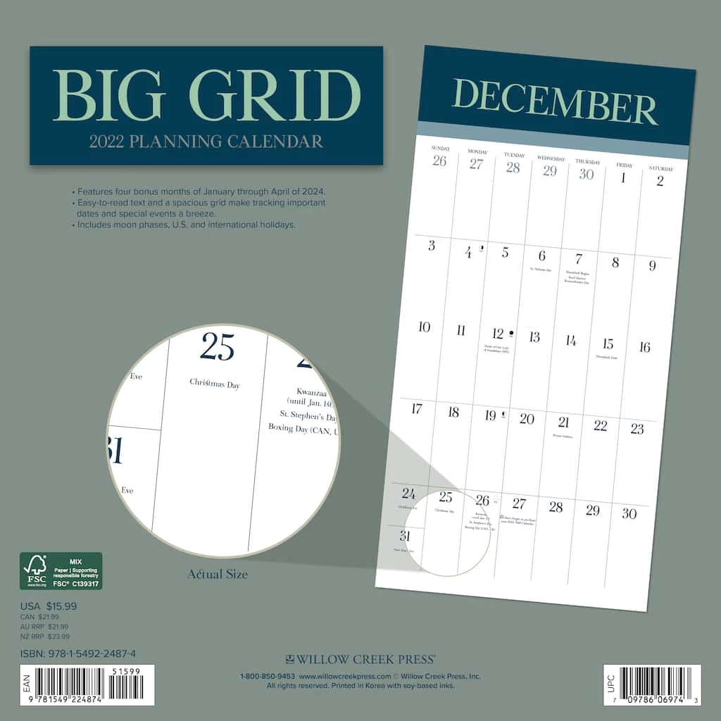 Form follows function in this sophisticated, jewel-toned planning calendar. Printed with soy-based inks on FSC certified paper, this 12″ x 12″ wall calendar features extra-large monthly grids that offer ample room for jotting notes, along with four bonus months of January through April of 2024. Also includes moon phases (CST), standard U.S. and international holidays.