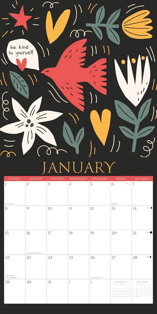 Take wing with creative perspective in this folk-art-inspired wall calendar. Monthly illustrations pair with uplifting inspirations to encourage oneβs own resilience and tenacity when navigating the world with sense of purpose and a desire to do good. Printed with soy-based inks on FSC certified paper, this 12βx 12β wall calendar features large monthly grids that offer ample room for jotting notes, along with six bonus months of July through December of 2022. It also includes moon phases (CST), standard U.S., and international holidays.
