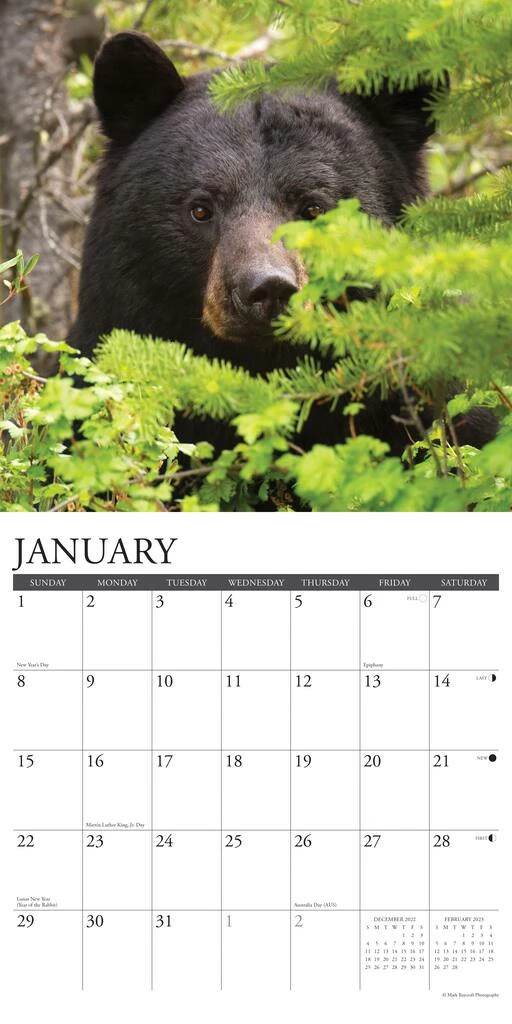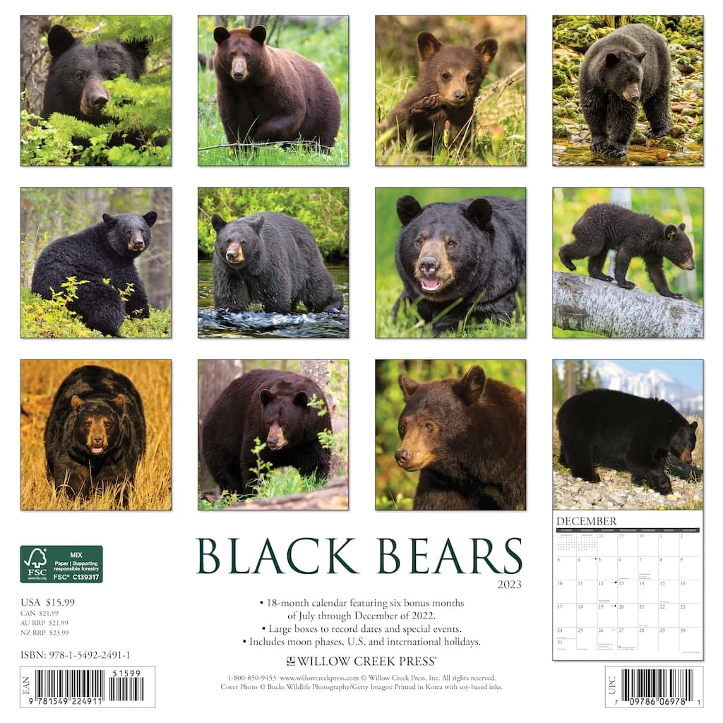 The highly adaptable and secretive black bear ranges throughout North America including at least 40 of the United States. These twelve superb full color photographs feature black bears in their natural environment. Printed with soy-based inks on FSC certified paper, this 12″ x 12″ wall calendar features large monthly grids that offer ample room for jotting notes, along with six bonus months of July through December of 2022. It also includes moon phases (CST), standard U.S. and international holidays.