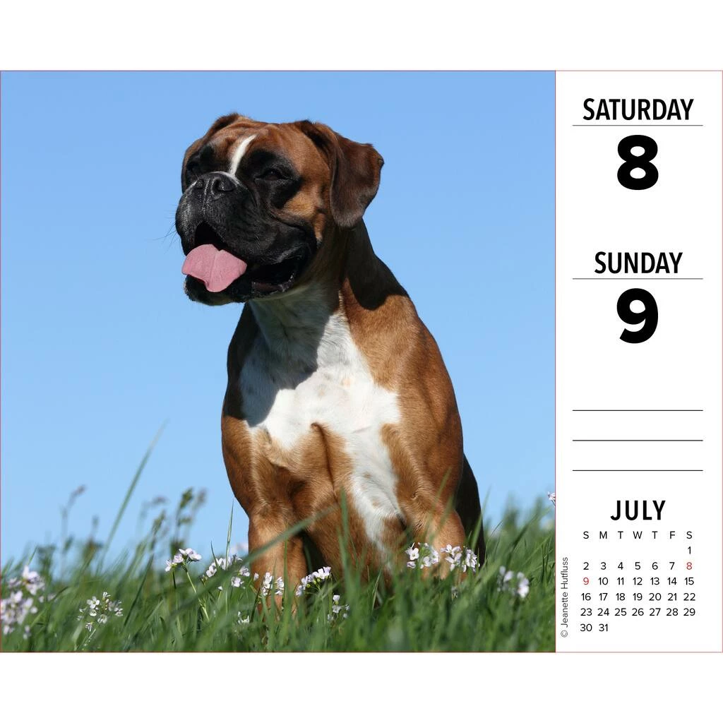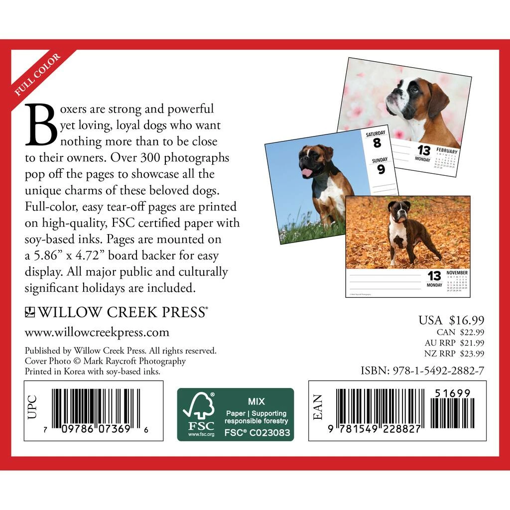 Boxers are strong and powerful yet loving, loyal dogs who want nothing more than to be close to their owners. 310 full-color photographs pop off each page to showcase all the unique charms and characteristics of these beloved dogs. Full-color images on easy tear-off pages are printed on high quality, FSC certified paper with soy-based inks. Pages are mounted on a recyclable plastic stand for easy display. All major public and culturally significant holidays are included.