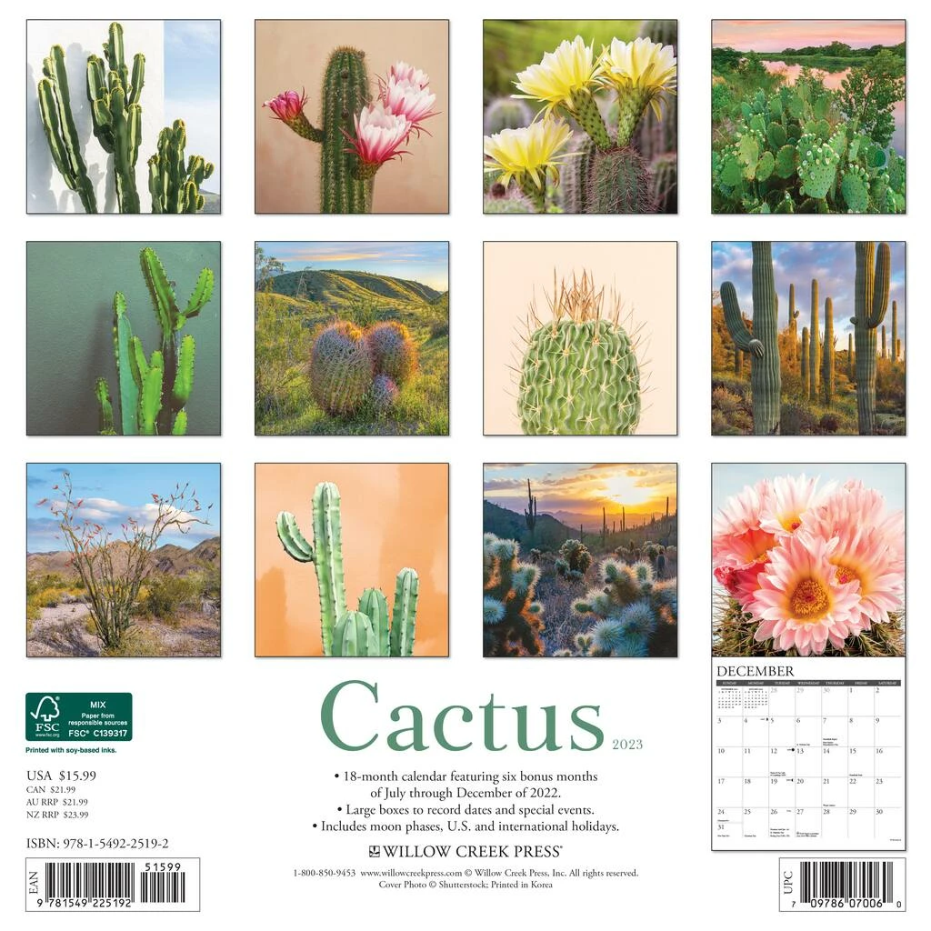 Cacti come in bold variety of shapes, sizes and colors. Partial to desert regions, the beauty of these prickly succulents is on full display in our 2023 Cactus wall calendar. Printed with soy-based inks on FSC certified paper, this 12″ x 12″ wall calendar features large monthly grids that offer ample room for jotting notes, along with six bonus months of July through December of 2022. It also includes moon phases (CST), standard U.S. and international holidays.