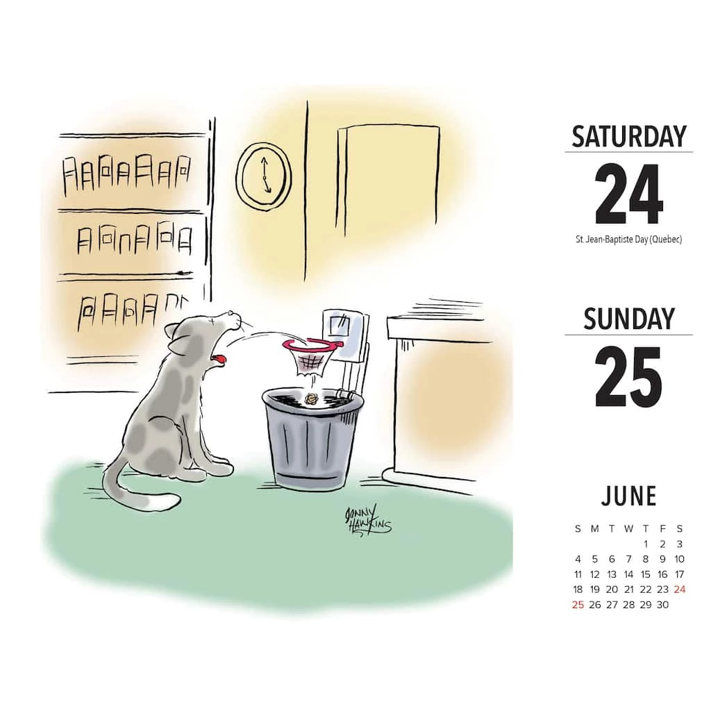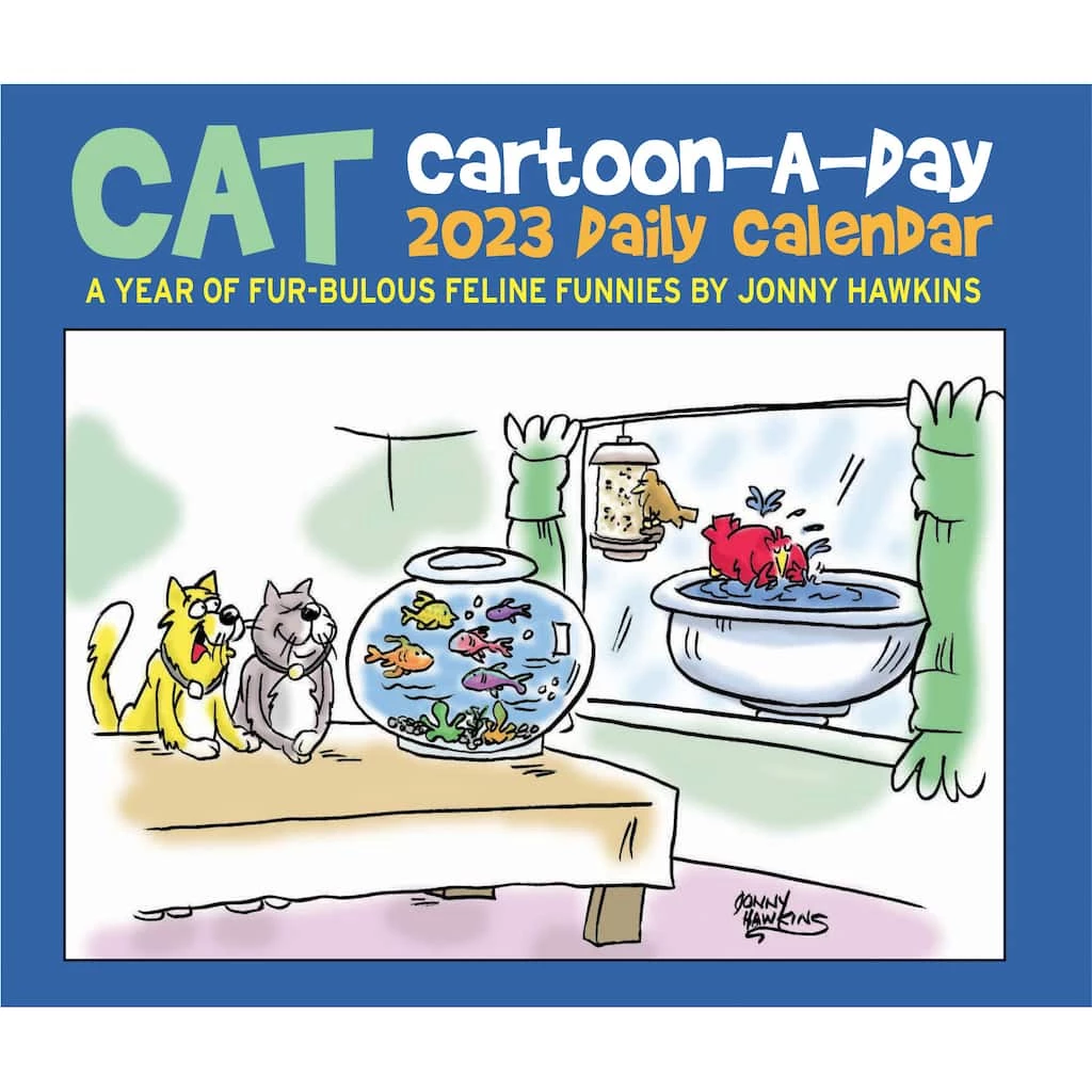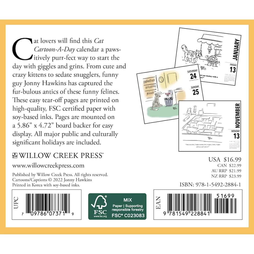 Good mews! TheΒ Cat Cartoon-A-Day 2023 CalendarΒ offers a yearβs worth of fur-bulous feline funnies courtesy of punny-guy Jonny Hawkins. Each day, paws-itively delightful doodles illustrate the inherent comedy in the many perplexing personalities of cats. From cute and crazy kittens to grumpy, retired mousersβthe curious pusses in these playful cartoons pounce on the funny bones of cat lovers everywhere. Full-color images on easy tear-off pages are printed on high quality, FSC certified paper with soy-based inks. Pages are mounted on a recyclable plastic stand for easy display. All major public and culturally significant holidays are included.