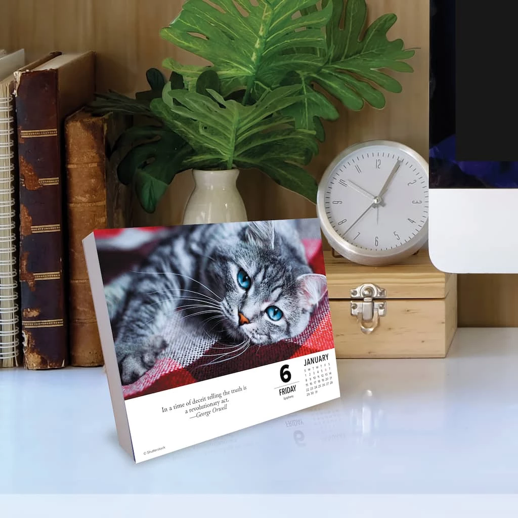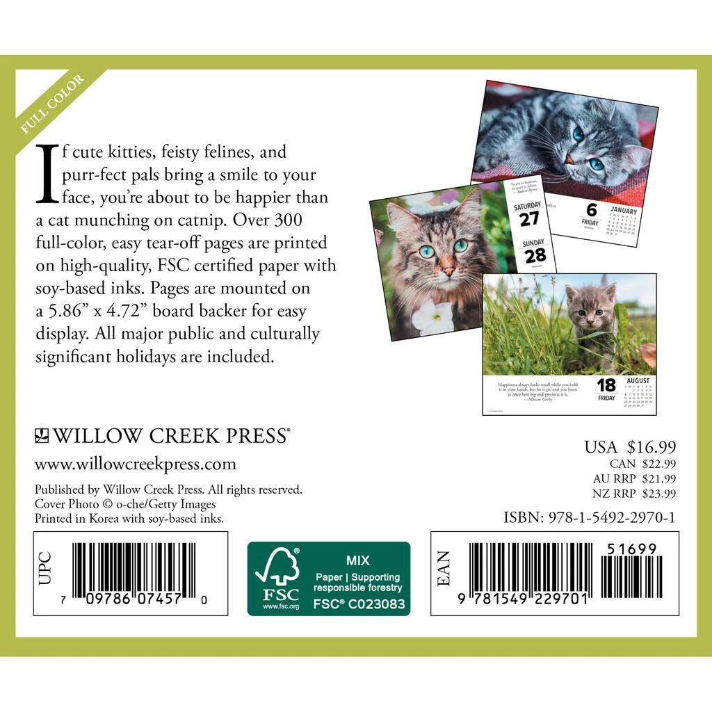 If cute kitties, feisty felines, and purr-fect pals bring a smile to your face, youβre about to be happier than a cat munching on catnip. Over 300 full-color, easy tear-off pages are printed on high-quality, FSC certified paper with soy-based inks. Pages are mounted on a 5.86″ x 4.72″ board backer for easy display. All major public and culturally significant holidays are included.