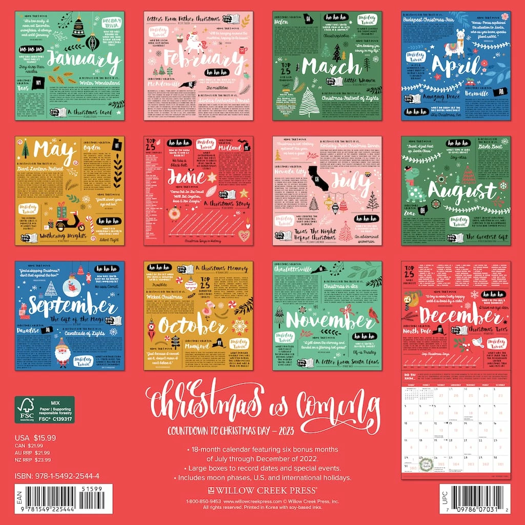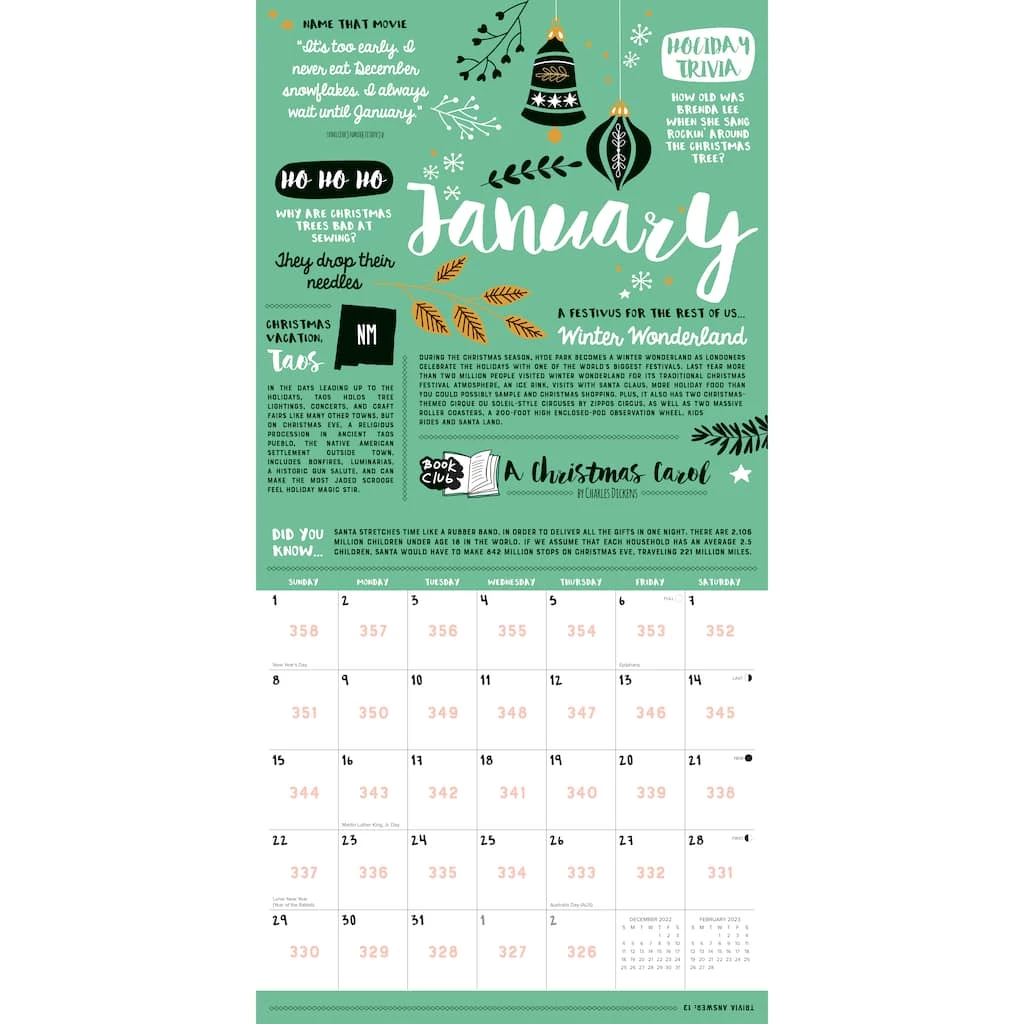 You know that co-worker that listens to Jingle Bells in July or pre-decorates their tiny office Christmas tree in October? The family member that canβt get enough peppermint lattes, glitter or ugly sweaters? This is the calendar for them! Celebrate the spirit of the season all year long with a 365-day countdown to the jolliest of holidays. Printed with soy-based inks on FSC certified paper, this 12″ x 12″ wall calendar features large monthly grids that offer ample room for jotting notes, along with six bonus months of July through December of 2022. Also includes moon phases (CST), standard U.S. and international holidays.