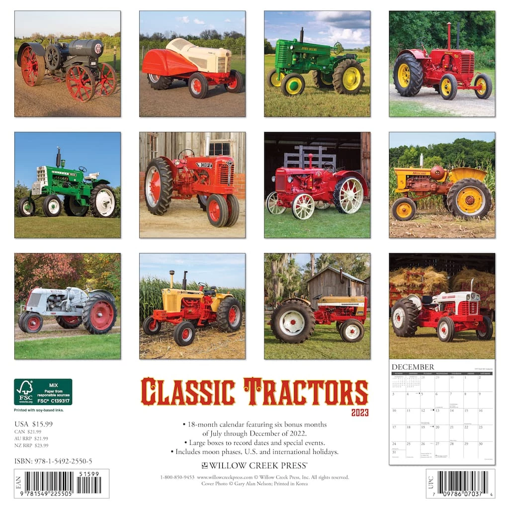 Farmall, Ford, John Deere, Allis Chalmers – these tractors evoke memories of a past but fondly remembered era in agriculture. Printed with soy-based inks on FSC certified paper, this 12″ x 12″ wall calendar features large monthly grids that offer ample room for jotting notes, along with six bonus months of July through December of 2022. Also includes moon phases (CST), standard U.S. and international holidays.