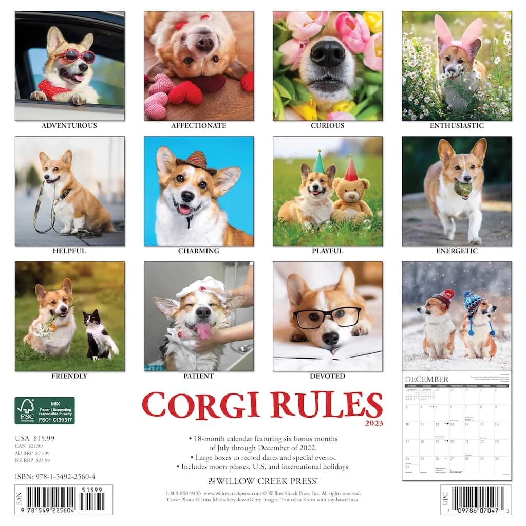 Don’t let those innocent dark eyes, fluffy coat, and winning smile fool you. Corgis are just as affectionate, smart, and alert as they appear! Each month exposes the unique virtues of this happy-go-lucky breed. Printed with soy-based inks on FSC certified paper, this 12″ x 12″ wall calendar features large monthly grids that offer ample room for jotting notes, along with six bonus months of July through December of 2022. Also includes moon phases (CST), standard U.S., and international holidays.