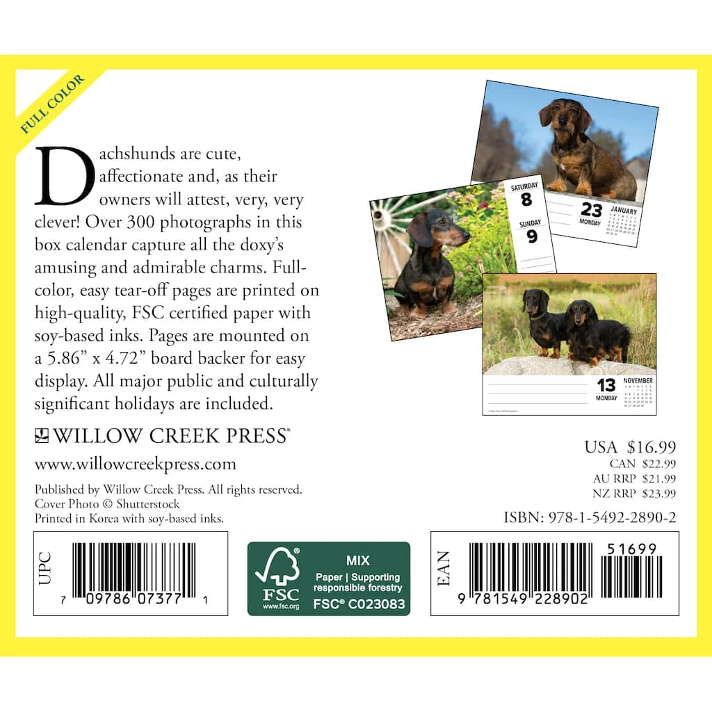 Dachshunds are cute, affectionate and, as their owners will attest, very, very clever! The 310 full-color photographs in this box calendar capture all the doxies amusing and admirable charms. All major public and culturally significant holidays are included.