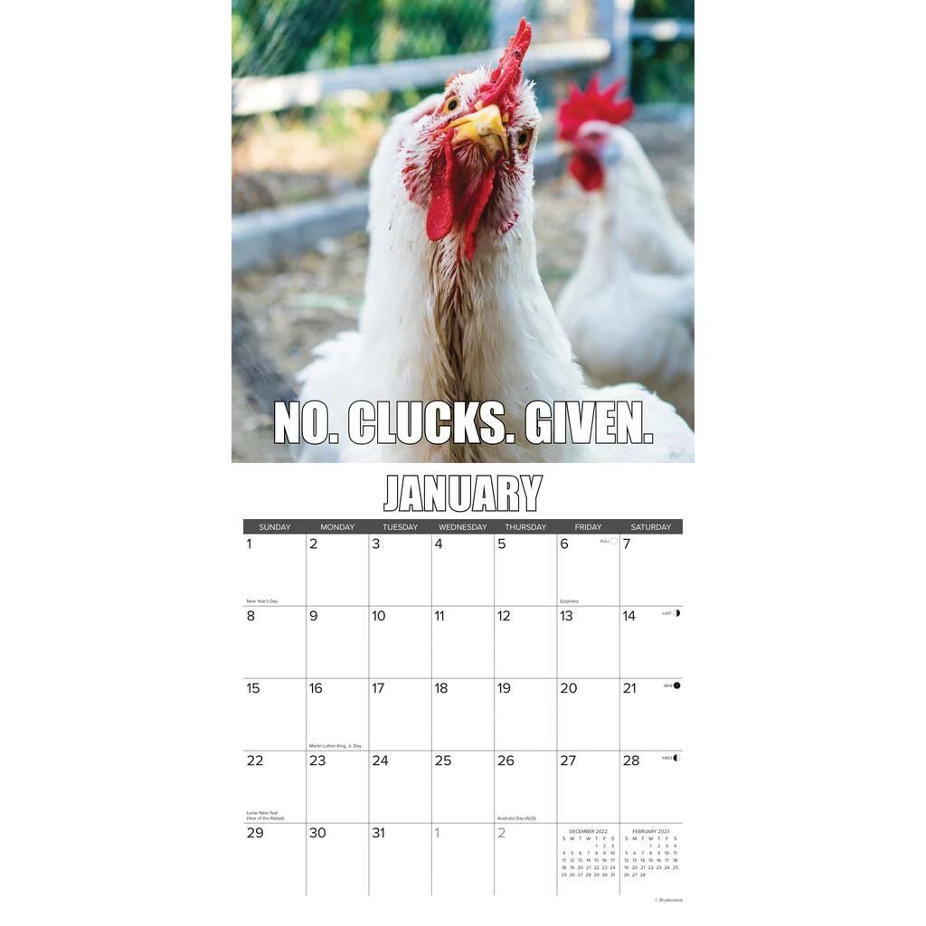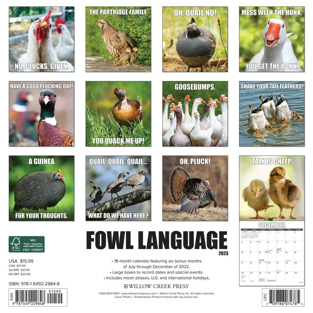 If you can take a yolk, this calendar is all it’s quacked up to be. Whether youβre in a fowl mood or feeling rather plucky, this meme-tastic collection of cracks is poultry in motion. Printed with soy-based inks on FSC certified paper, this 12″ x 12″ wall calendar features large monthly grids that offer ample room for jotting notes, along with six bonus months of July through December of 2022. Also includes moon phases (CST), standard U.S., and international holidays.