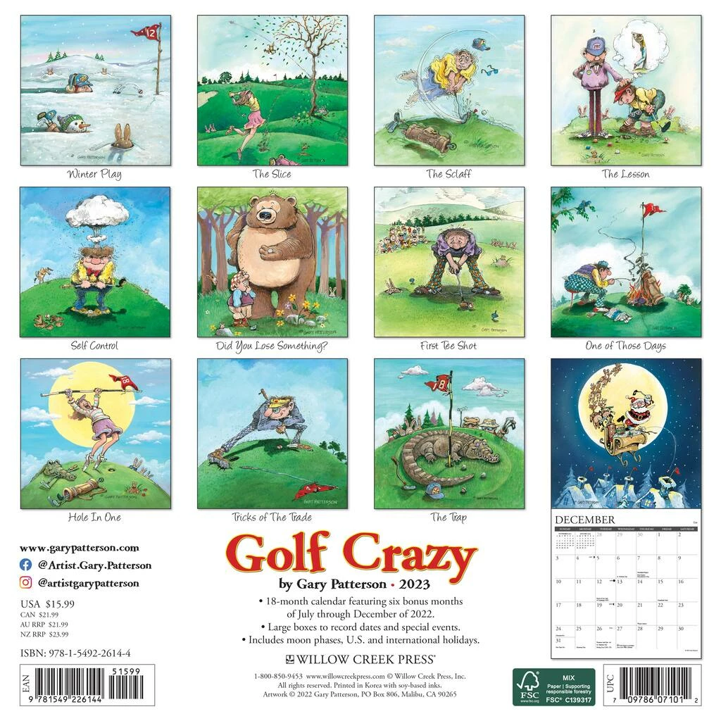 In Golf Crazy, well-loved artist Gary Patterson brings to life all the triumphs and frustrations of weekend warriors with his endearingly funny illustrations about the game of golf and those who play it. You’ll rate this hysterical collection way above par — and score a hole in one with golfer friends who receive it as a gift. Printed with soy-based inks on FSC certified paper, this 12″ x 12″ wall calendar features large monthly grids that offer ample room for jotting notes, along with six bonus months of July through December of 2022. Also includes moon phases (CST), standard U.S. and international holidays.