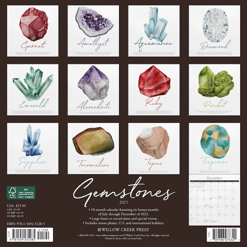 Legend has it that gemstones have bestowed good luck, health, power, and protection upon their owners for centuries. This calendar features a treasure trove of stunning illustrations along with notes about each gem’s symbolism and historical lore. Printed with soy-based inks on FSC certified paper, this 12″ x 12″ wall calendar features large monthly grids that offer ample room for jotting notes, along with six bonus months of July through December of 2022. Also includes moon phases (CST), standard U.S., and international holidays.