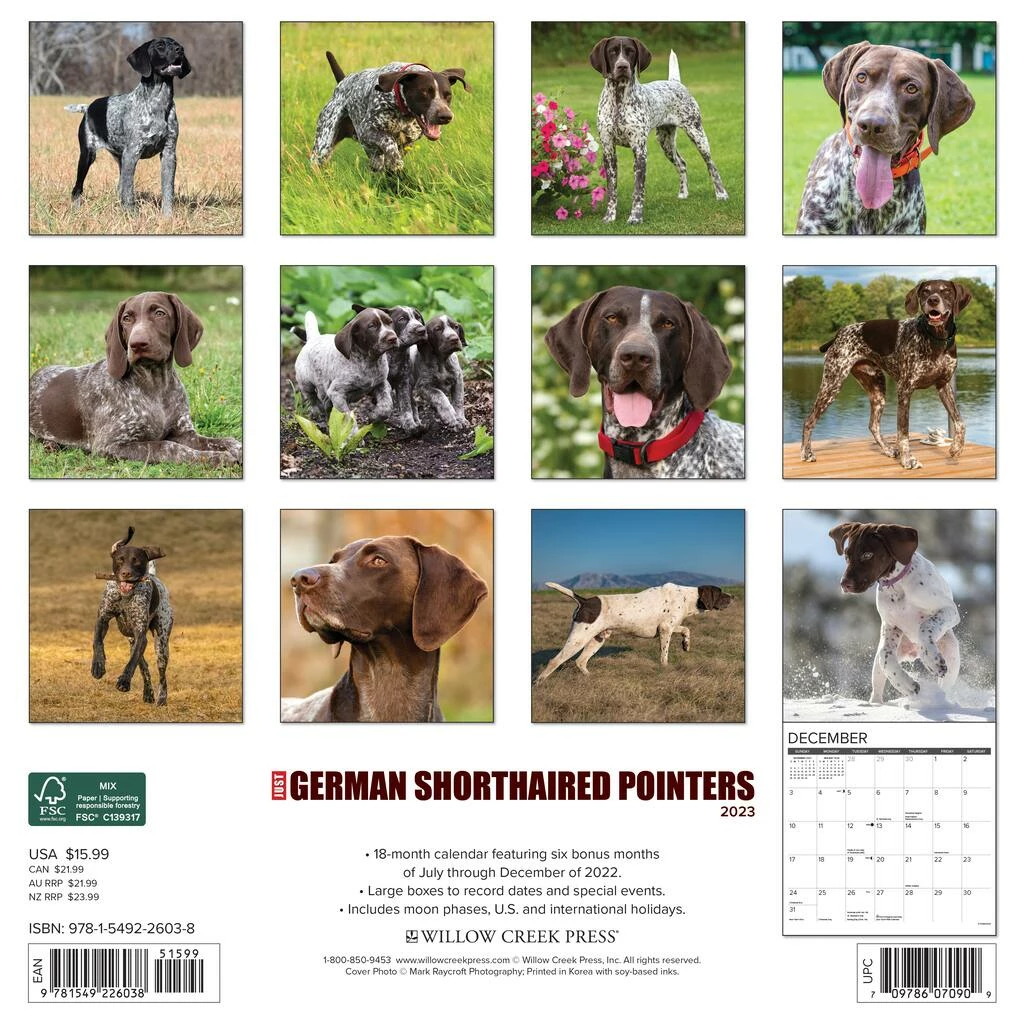 These athletic, hardworking pointers were bred for hunting, yet they make excellent family dogs. The German Shorthaired pointing instincts, great looks and general good nature are typified in these twelve stunning full color photographs. Printed with soy-based inks on FSC certified paper, this 12″ x 12″ wall calendar features large monthly grids that offer ample room for jotting notes, along with six bonus months of July through December of 2022. Also includes moon phases (CST), standard U.S. and international holidays.