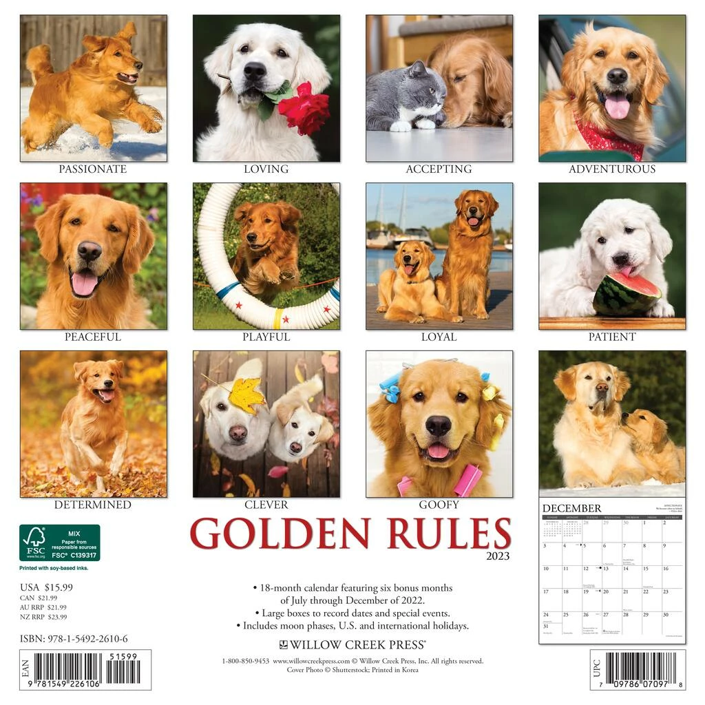 Golden Retrievers represent all the finest virtues of the canine character. Each of these twelve rich photographs include text indicating a special lifeβs lesson that we humans can learn from this wonderful breed. Printed with soy-based inks on FSC certified paper, this 12″ x 12″ wall calendar features large monthly grids that offer ample room for jotting notes, along with six bonus months of July through December of 2022. Also includes moon phases (CST), standard U.S. and international holidays.