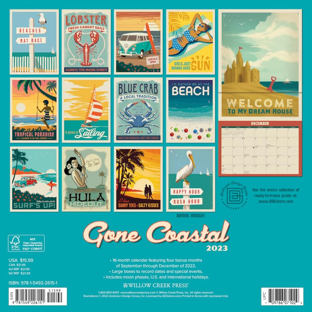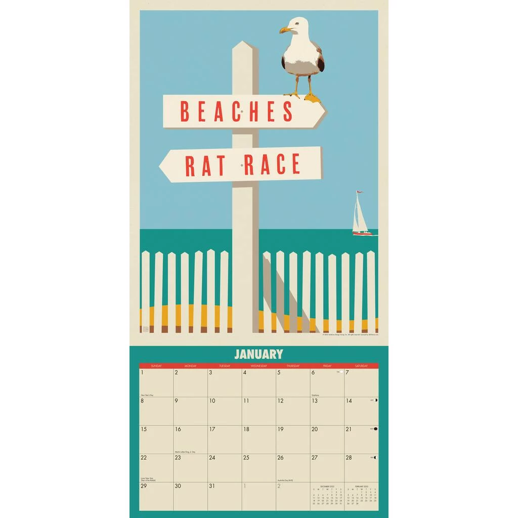 If the cure for anything is salt water, it’s time to chart a course to the seashore. Inspired by poster art from the late 1800s to the mid-1900s, Anderson Design Group has created a collection of illustrations celebrating the best coastal destinations from Aruba to Cape Cod. Each month highlights an iconic location with striking perspectives, vibrant colors, and vintage lettering. Printed with soy-based inks on FSC certified paper, this 12″ x 12″ wall calendar features condensed monthly grids, along with four bonus months of September through December of 2022. Also includes moon phases (CST), standard U.S., and international holidays.