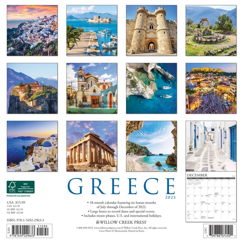 Opa! Seeped in history, mythology, and tradition, Greece stands as the cradle of democracy and is one of the Mediterraneanβs most intoxicating gems. From its iconic blue domes to its never-ending coastlines, itβs easy to see why everyone wants to be Greek. Printed with soy-based inks on FSC certified paper, this 12″ x 12″ wall calendar features large monthly grids that offer ample room for jotting notes, along with six bonus months of July through December of 2022. Also includes moon phases (CST), standard U.S., and international holidays.