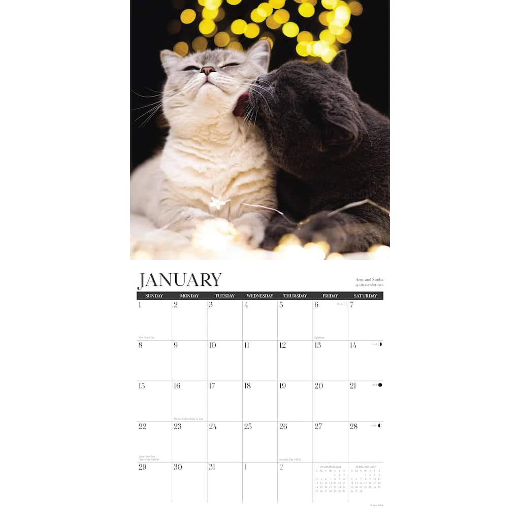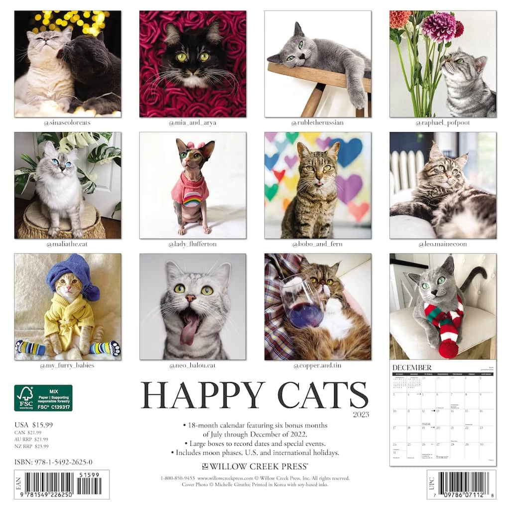 Who doesnβt like a happy cat? These cats and kittens are here to brighten your day, lighten your mood and make you crack a smile when you need it the most. Add these new favorite faces to your Instagram feed to get to know them and keep up with their latest exploits and adventures. Printed with soy-based inks on FSC certified paper, this 12″ x 12″ wall calendar features large monthly grids that offer ample room for jotting notes, along with six bonus months of July through December of 2022. Also includes moon phases (CST), standard U.S. and international holidays.