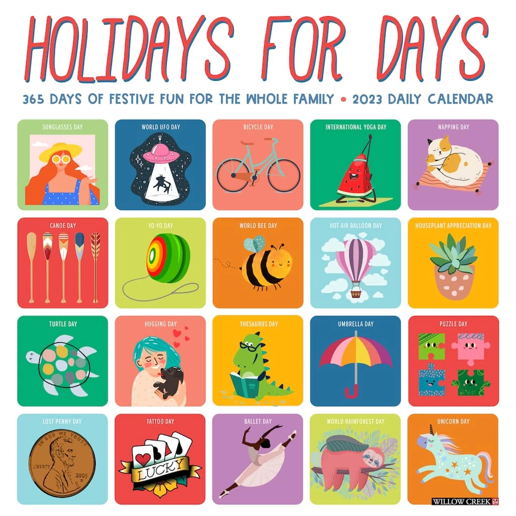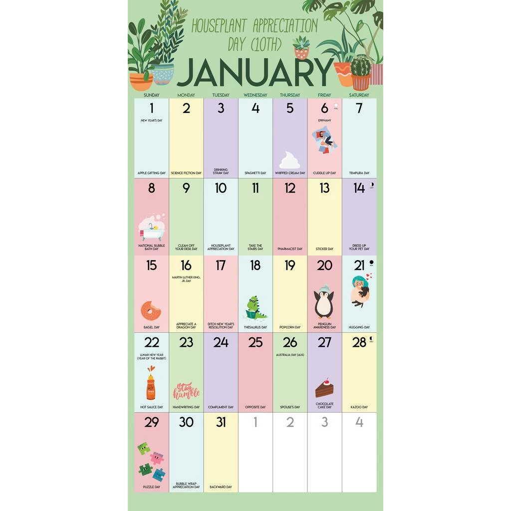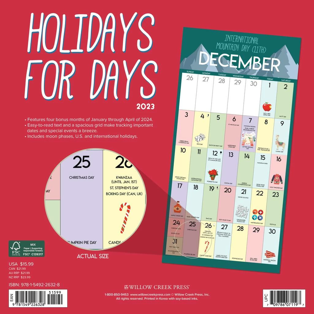 It’s easy to look forward to the day ahead when you know that every day is a holiday! Holidays for Days celebrates that each day is a gift. From Hot Sauce Day to Doughnut Day and VCR Day to Squirrel Appreciation Day, it’s the most fun you can have enjoying the present. Printed with soy-based inks on FSC certified paper, this 12″ x 12″ wall calendar features large monthly grids that offer ample room for jotting notes, along with six bonus months of July through December of 2022. Also includes moon phases (CST), standard U.S. and international holidays.