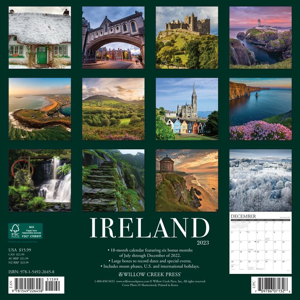 The diverse and beautiful Emerald Isle displays its special magic to you each month of the year! Stand on a craggy height to view sweeping coastlines, tour ancient ruins, visit quaint villages, cottages and classic pubs all year long. Printed with soy-based inks on FSC certified paper, this 12″ x 12″ wall calendar features large monthly grids that offer ample room for jotting notes, along with six bonus months of July through December of 2022. Also includes moon phases (CST), standard U.S. and international holidays.