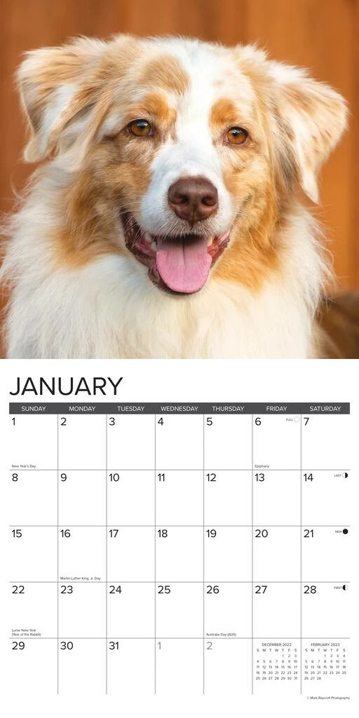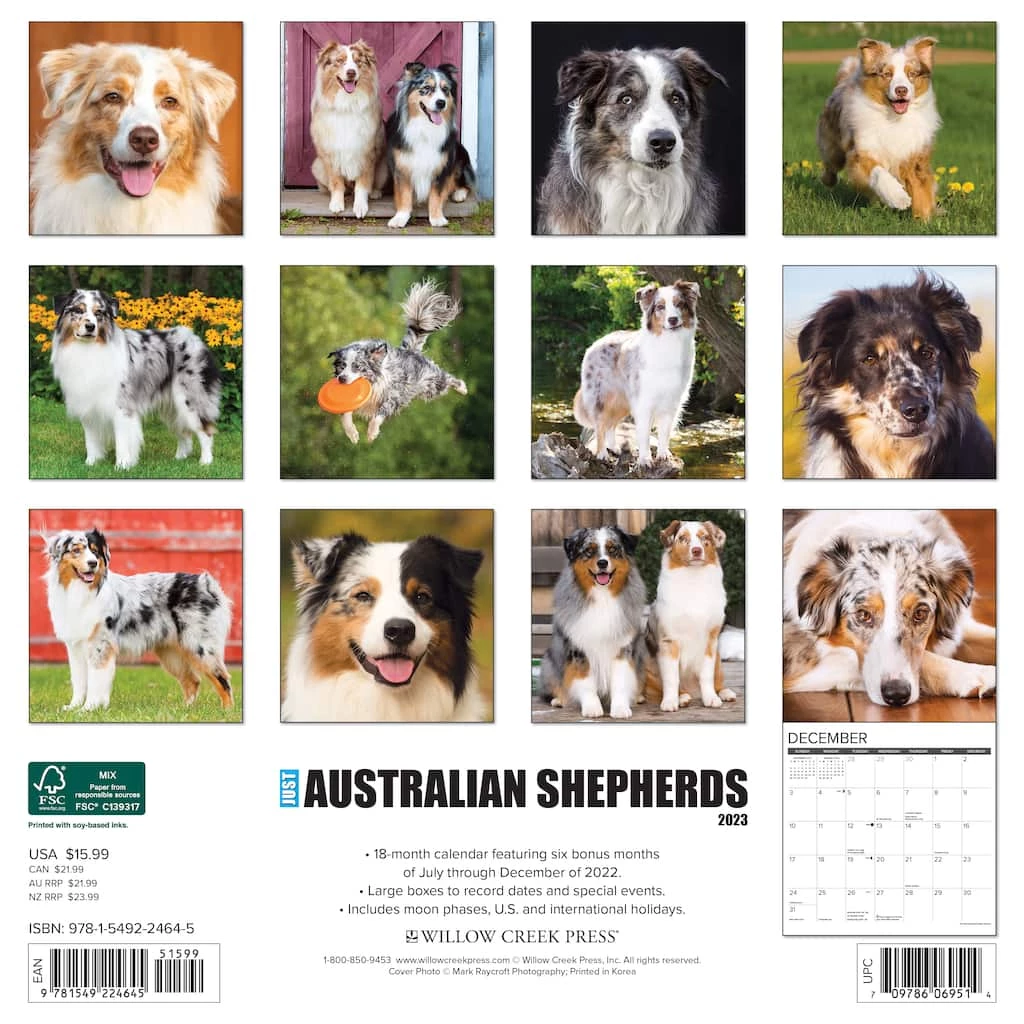 Australian Shepherds are known for their intelligence, trainability, high energy and playfulness. While they make terrific pets, they are also highly valued by ranchers for their inherent herding traits and willingness to please. Twelve delightful โAussieโ photos grace this full color wall calendar with large daily grids proving plenty of space for notes and reminders. Printed with soy-based inks on FSC certified paper, this 12″ x 12″ wall calendar features large monthly grids that offer ample room for jotting notes, along with six bonus months of July through December of 2022. It also includes moon phases (CST), standard U.S. and international holidays.