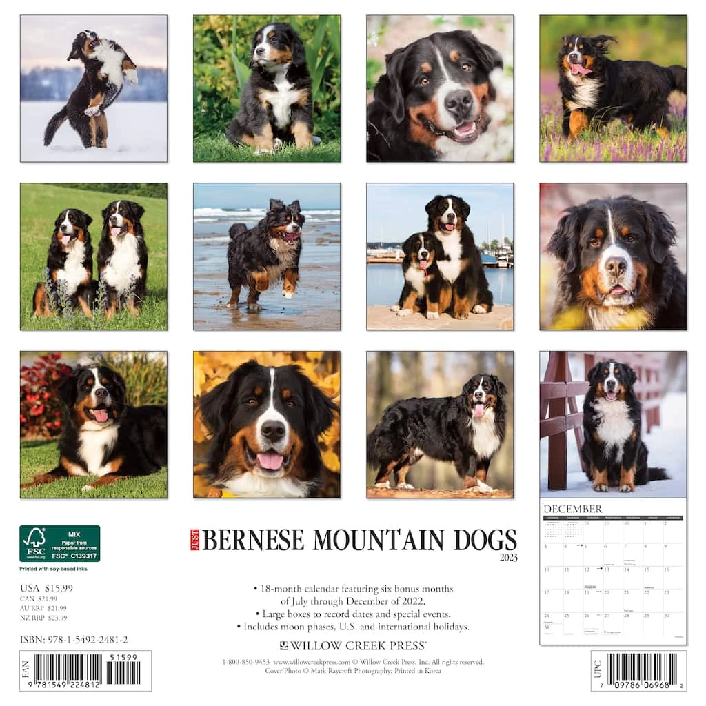 It’s hard to believe that Bernese Mountain Dogs were bred for working given their penchant for cheerfulness and simply having fun. These handsome, good-natured dogs are celebrated in twelve vivid, full color images. Printed with soy-based inks on FSC certified paper, this 12″ x 12″ wall calendar features large monthly grids that offer ample room for jotting notes, along with six bonus months of July through December of 2022. Also includes moon phases (CST), standard U.S. and international holidays.