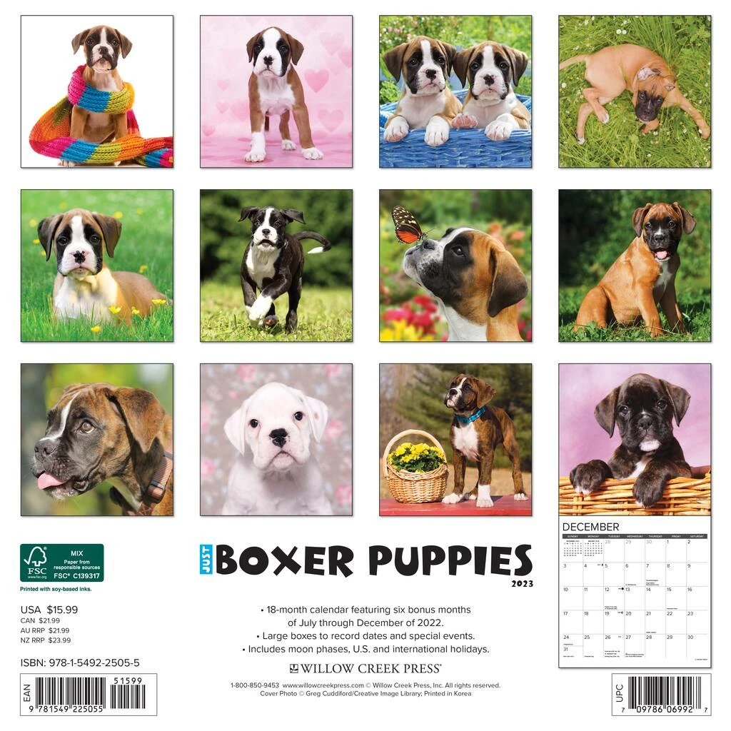 They will eventually grow up to be handsome and powerful dogs, but puppyhood is that short time for Boxers to just clown around and have fun. These twelve endearing full color photos capture all their cuteness. Printed with soy-based inks on FSC certified paper, this 12″ x 12″ wall calendar features large monthly grids that offer ample room for jotting notes, along with six bonus months of July through December of 2022. It also includes moon phases (CST), standard U.S. and international holidays.