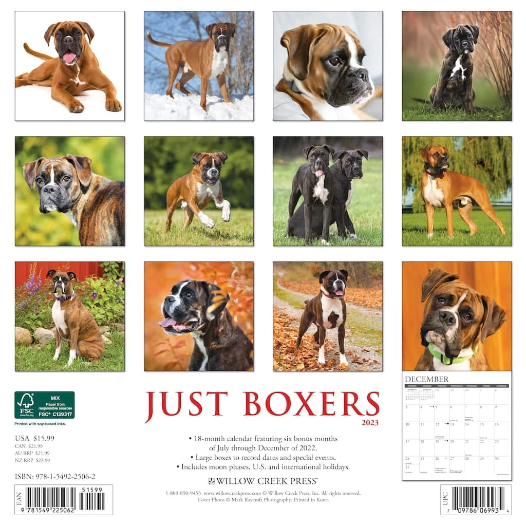 Boxers are strong and powerful yet loving, loyal dogs who wish nothing more than to be close to family. This wall calendar dazzles the eye with twelve brilliant full color Boxer photographs. Printed with soy-based inks on FSC certified paper, this 12″ x 12″ wall calendar features large monthly grids that offer ample room for jotting notes, along with six bonus months of July through December of 2022. It also includes moon phases (CST), standard U.S. and international holidays.