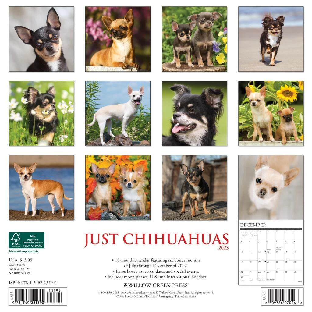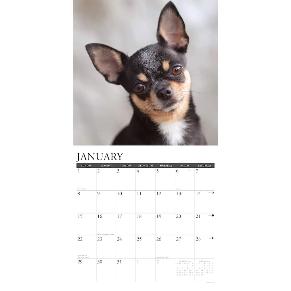 Although itβs the smallest of all AKC breeds, the Chihuahua is big on affection, loyalty and intelligence. Enjoy a full years’ worth of these little bundles of joys via twelve, cheerful, full-color photos. The large format features daily grids providing ample room for jotting appointments, birthdays and reminders, six bonus months of July through December 2022, moon phases and U.S. and international holidays.