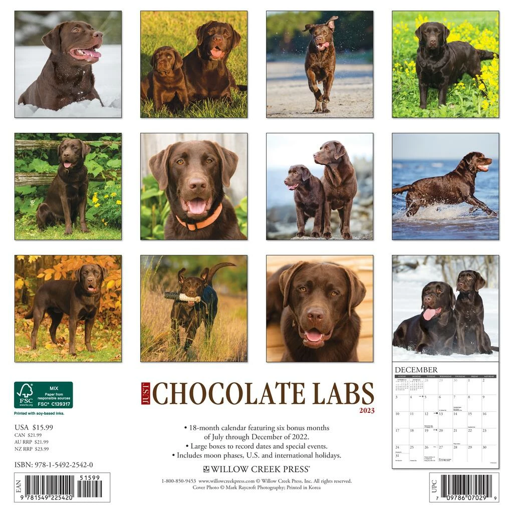 Their rich, brown coats; happy, intelligent faces and athletic bodies make Chocolate Labs a sight to behold. These twelve stunning photographs embody their power, affection and charm. Printed with soy-based inks on FSC certified paper, this 12″ x 12″ wall calendar features large monthly grids that offer ample room for jotting notes, along with six bonus months of July through December of 2022. Also includes moon phases (CST), standard U.S. and international holidays.