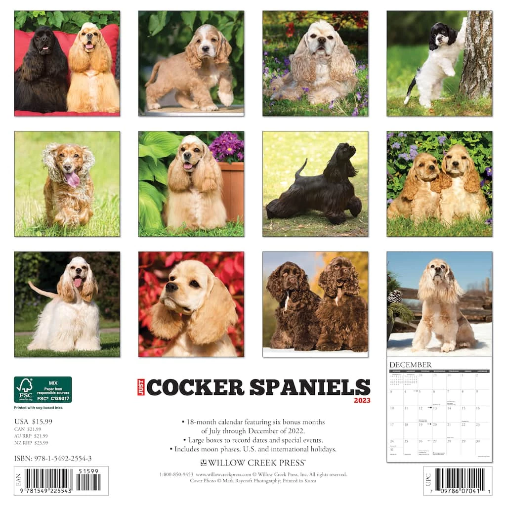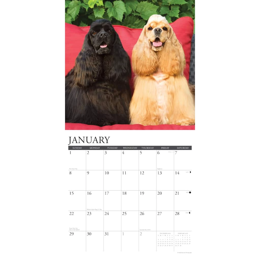 Cocker Spaniels are known for their sweet dispositions and charming demeanor. Twelve delightful photographs showcase all there is to love in these brown eyed, long eared charmers. Printed with soy-based inks on FSC certified paper, this 12″ x 12″ wall calendar features large monthly grids that offer ample room for jotting notes, along with six bonus months of July through December of 2022. Also includes moon phases (CST), standard U.S. and international holidays.