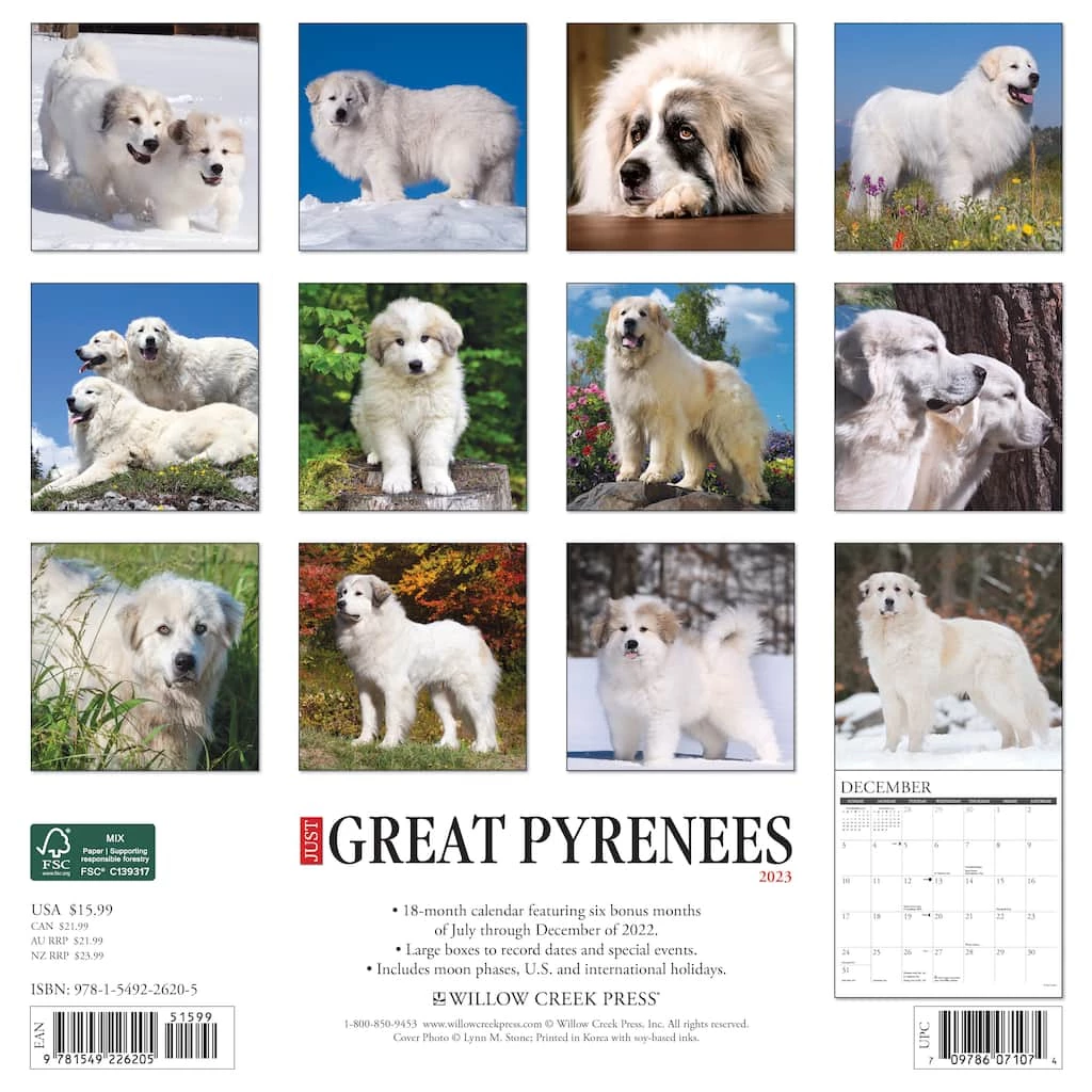 The Great Pyrenees breed traces its beginnings prior to the middle ages and has maintained its nobility, courage and weather-resistant coat to the present day. These gentle, loyal and affectionate dogs make terrific family members. Printed with soy-based inks on FSC certified paper, this 12″ x 12″ wall calendar features large monthly grids that offer ample room for jotting notes, along with six bonus months of July through December of 2022. Also includes moon phases (CST), standard U.S. and international holidays.