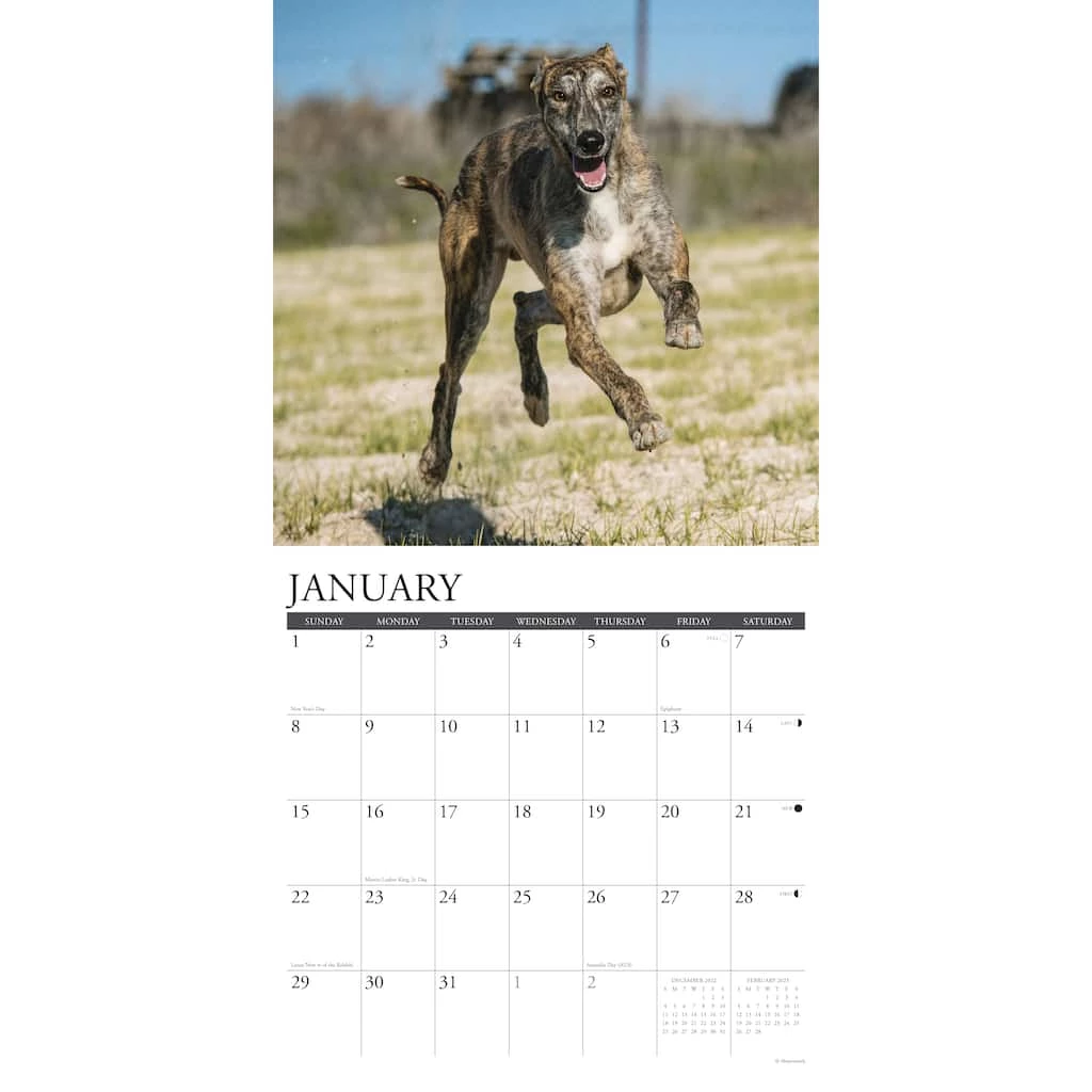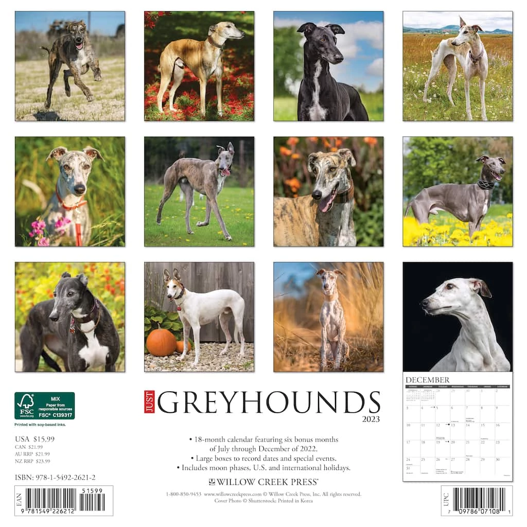 These twelve stunning full color photographs capture all the grace, charm and intelligence that embody the Greyhound. Printed with soy-based inks on FSC certified paper, this 12″ x 12″ wall calendar features large monthly grids that offer ample room for jotting notes, along with six bonus months of July through December of 2022. Also includes moon phases (CST), standard U.S. and international holidays.