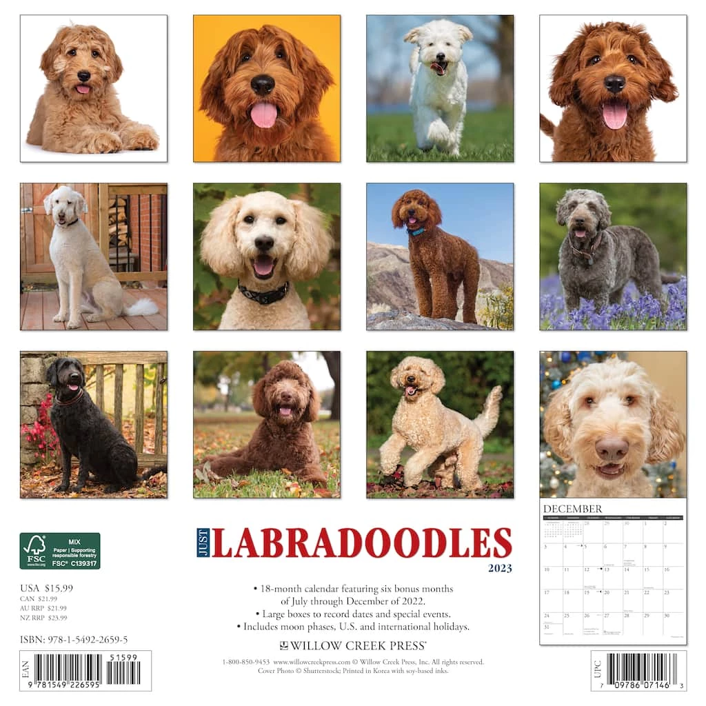 Although relatively new to the world of dogdom, Labradoodles (a hybrid cross between Labrador Retrievers and Poodles) are gaining in popularity everywhere due to their jaunty good looks and friendly nature. Printed with soy-based inks on FSC certified paper, “Doods” take center stage in this wall calendar featuring large monthly grids that offer ample room for jotting notes, along with six bonus months of July through December of 2022. Also includes moon phases (CST), standard U.S. and international holidays.