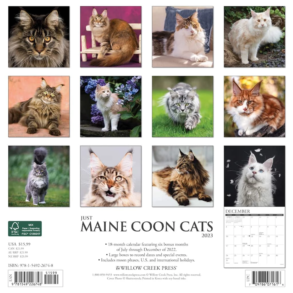 This big boned cat with the gorgeous, long flowing coat originated in North America but is now one of the most popular cat breeds in the world. Twelve stunning full color photographs capture the beauty, intelligence and gentleness of the Maine Coon Cat. Printed with soy-based inks on FSC certified paper, this 12″ x 12″ wall calendar features large monthly grids that offer ample room for jotting notes, along with six bonus months of July through December of 2022. Also includes moon phases (CST), standard U.S. and international holidays.