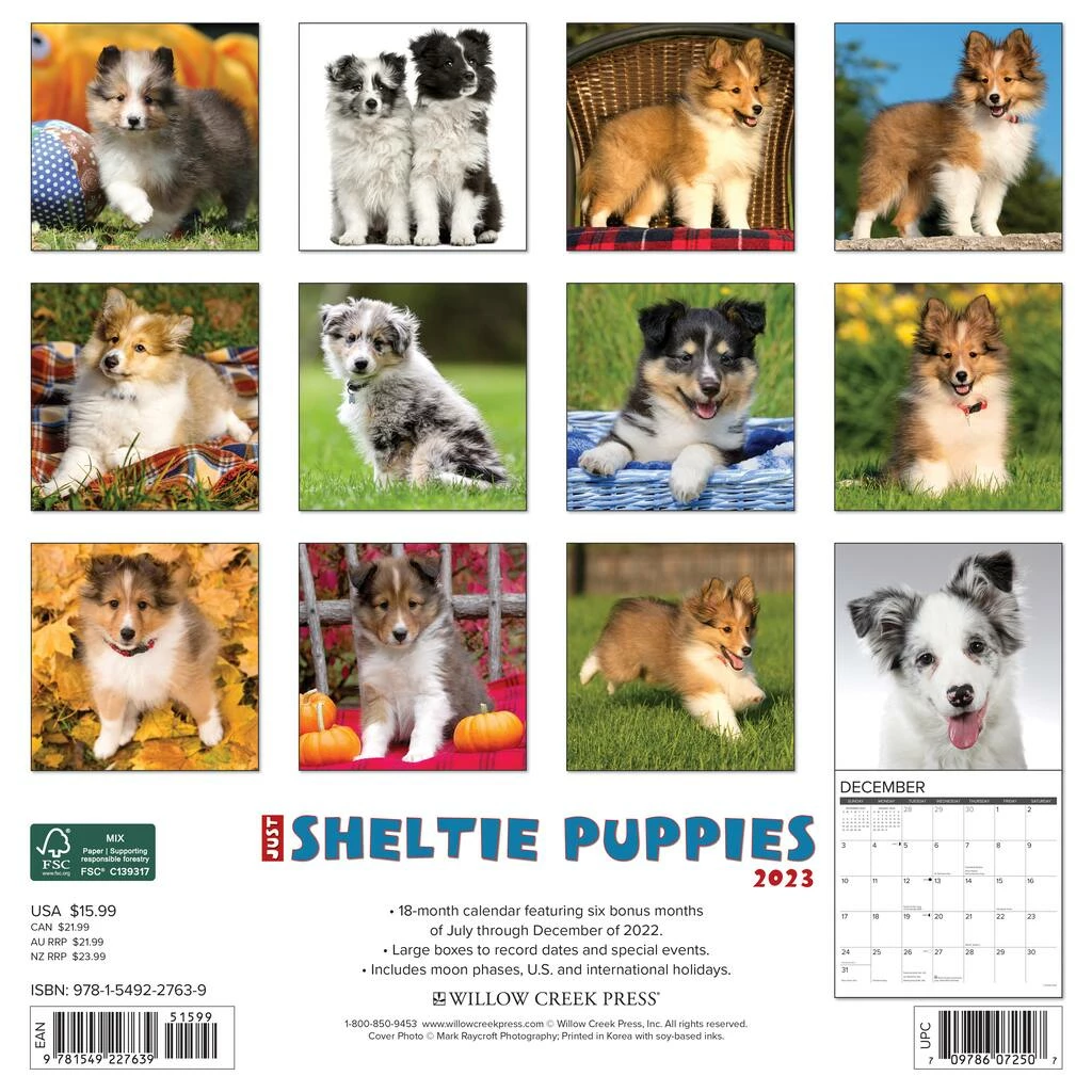 Twelve cheery, full color photographs of Sheltie puppies is so adorable you wish you could pick them up and cuddle them! Printed with soy-based inks on FSC certified paper, this 12″ x 12″ wall calendar features large monthly grids that offer ample room for jotting notes, along with six bonus months of July through December of 2022. Also includes moon phases (CST), standard U.S. and international holidays.