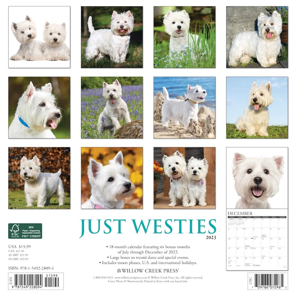 West Highland White terriers are perky, friendly and confident dogs with coats as bright as sunlit clouds. Twelve vivid full color photographs capture their spirit and wonderful characteristics. Printed with soy-based inks on FSC certified paper, this 12″ x 12″ wall calendar features large monthly grids that offer ample room for jotting notes, along with six bonus months of July through December of 2022. Also includes moon phases (CST), standard U.S. and international holidays.