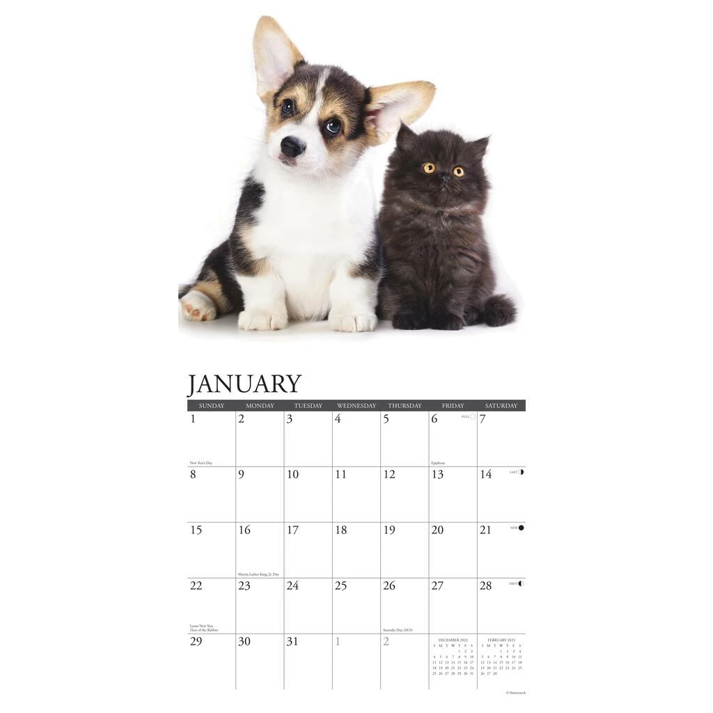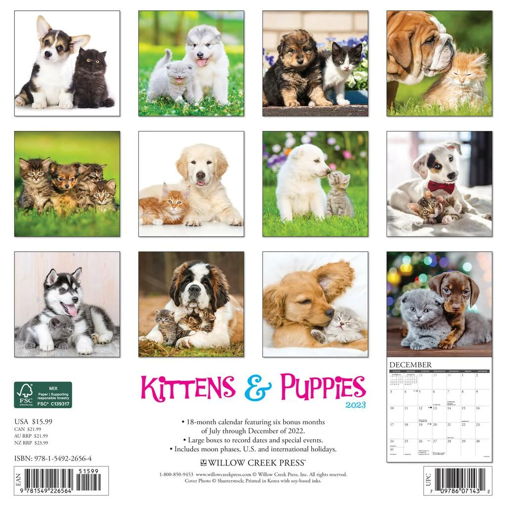 Apparently no one told these sweet little bundles of fur that dogs and cats arenβt supposed to get along! Twelve delightful full color photos celebrate friendship and innocence. Printed with soy-based inks on FSC certified paper, this 12″ x 12″ wall calendar features large monthly grids that offer ample room for jotting notes, along with six bonus months of July through December of 2022. Also includes moon phases (CST), standard U.S. and international holidays.